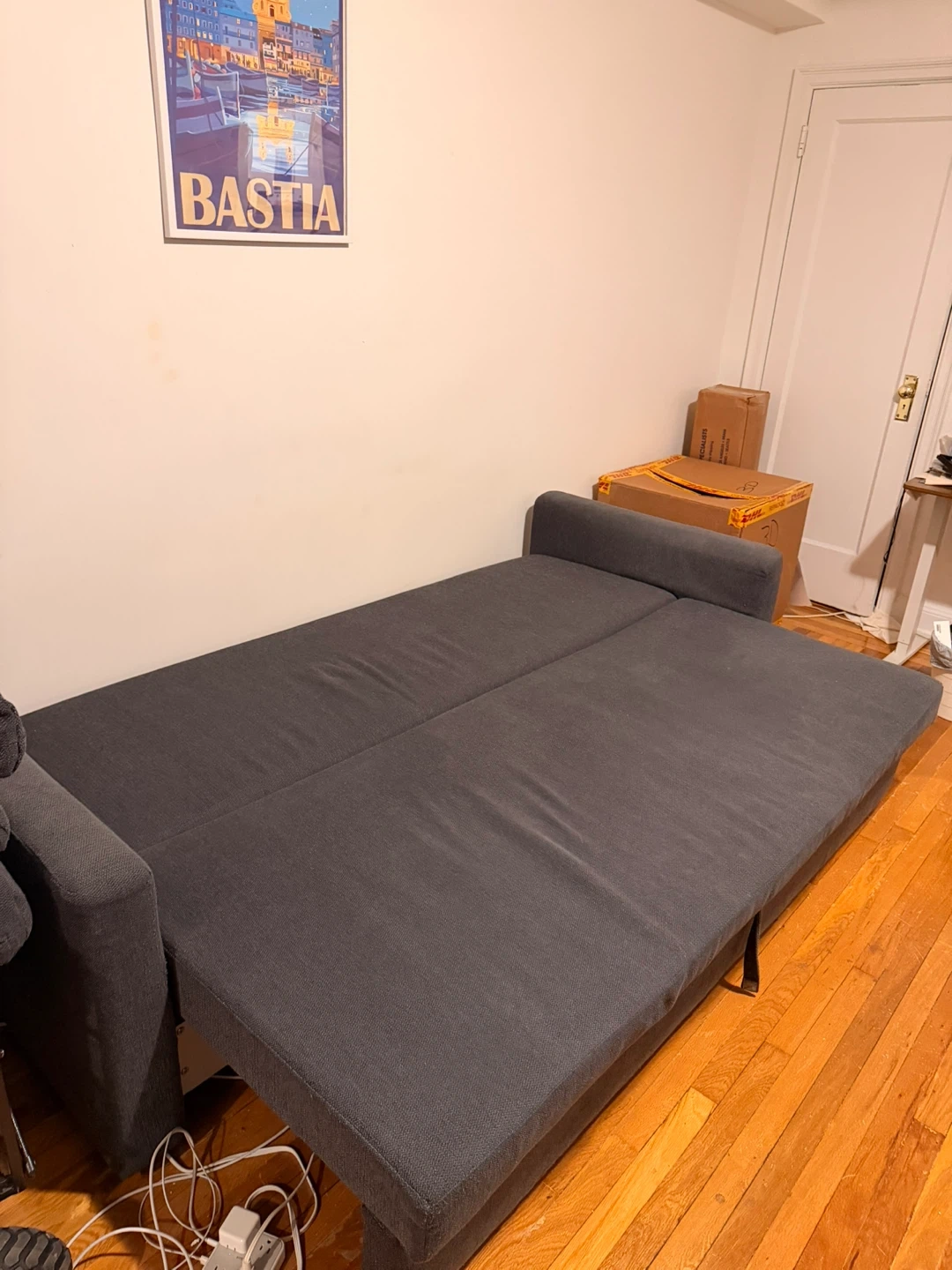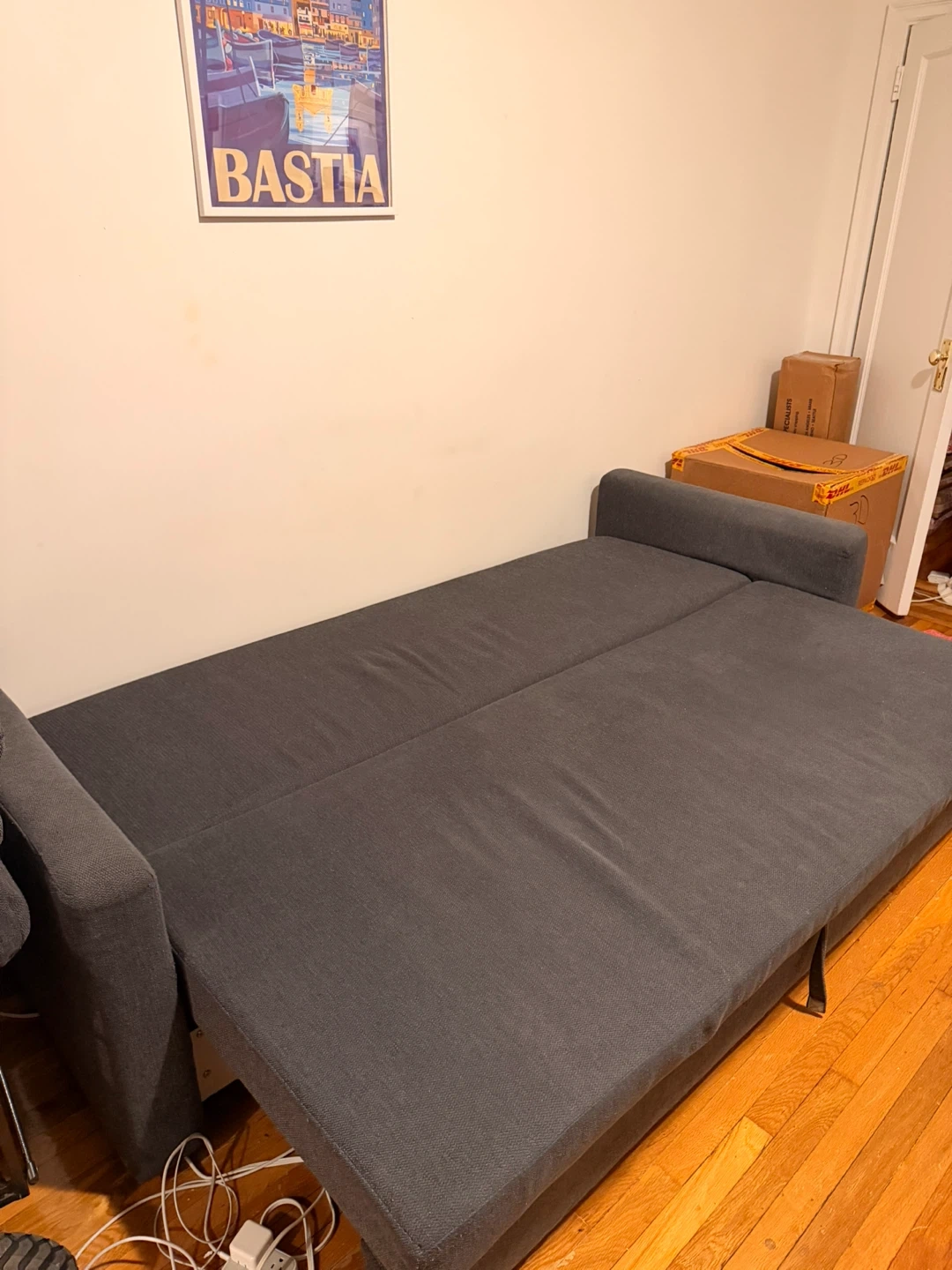 This is a dark gray sofa bed. It features a pull-out mattress for sleeping. Includes three matching throw pillows.