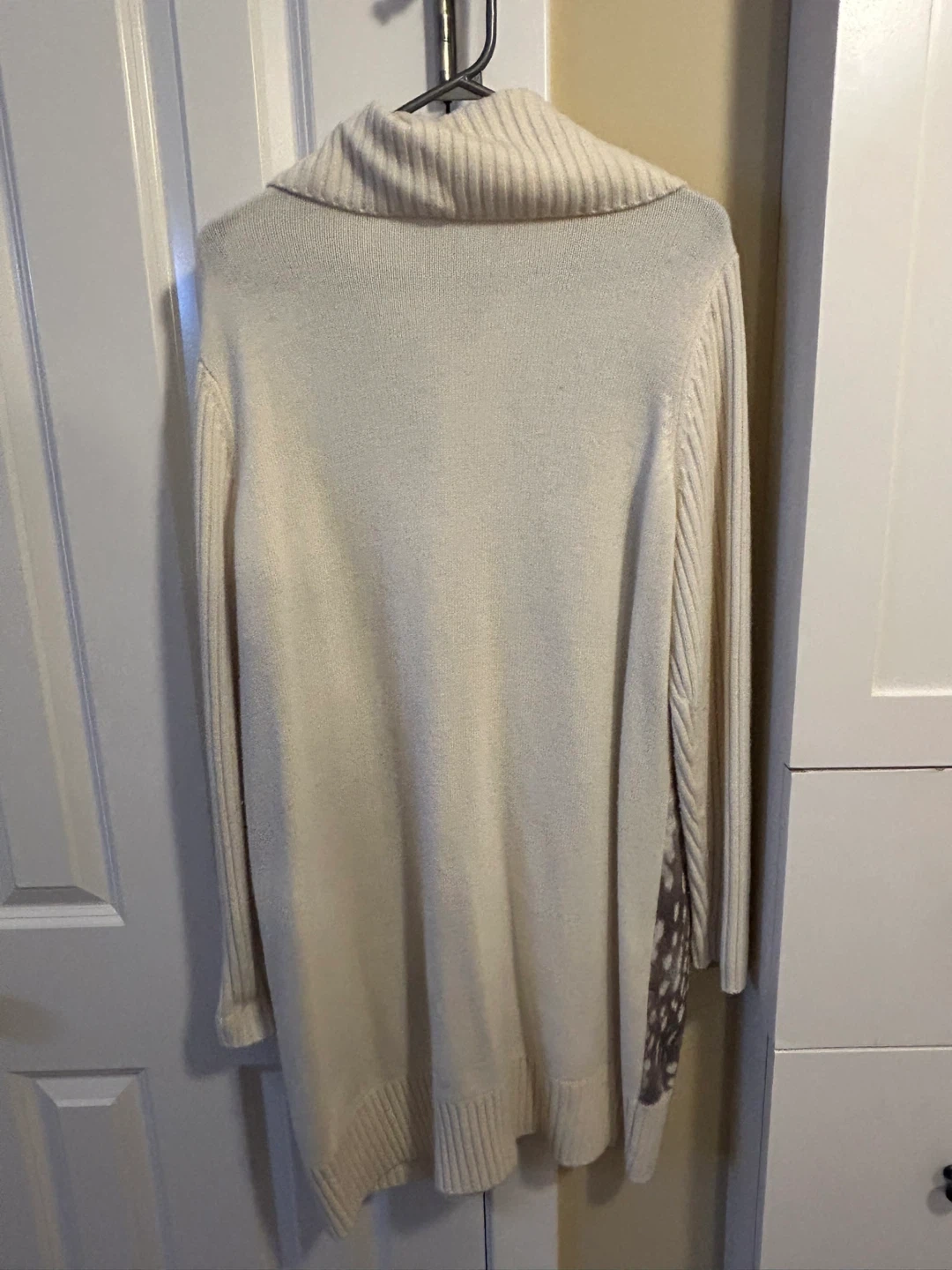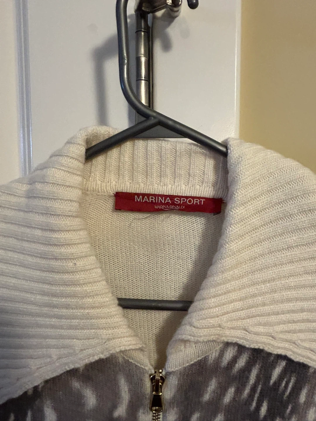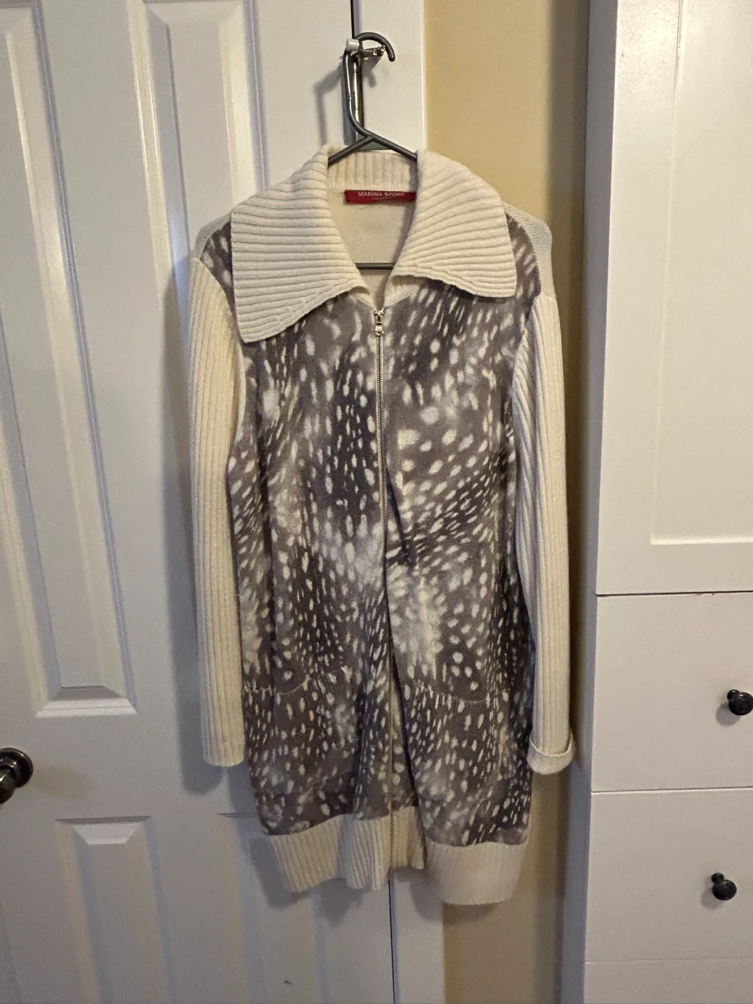 This Marina Sport cardigan sweater has a unique print on the front and cream-coloured knitted sleeves and back. It's a zip-up style with a cozy collar. It's perfect for adding a stylish layer to your outfit on cooler days.