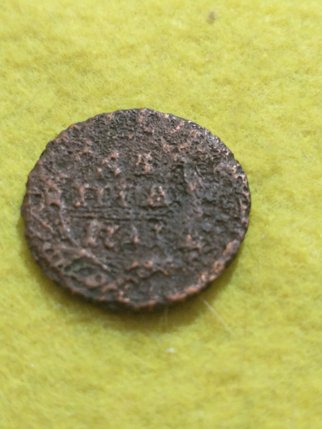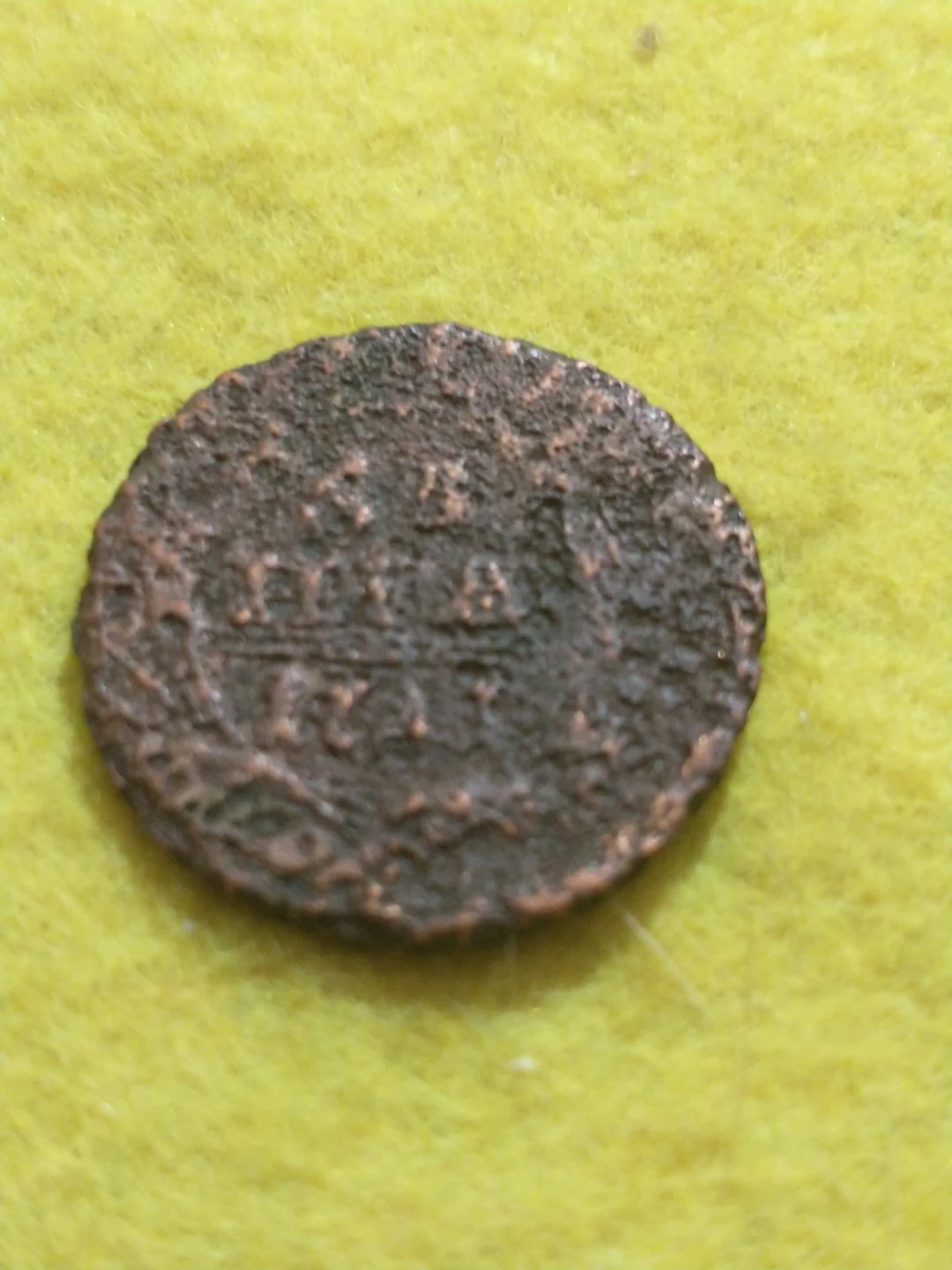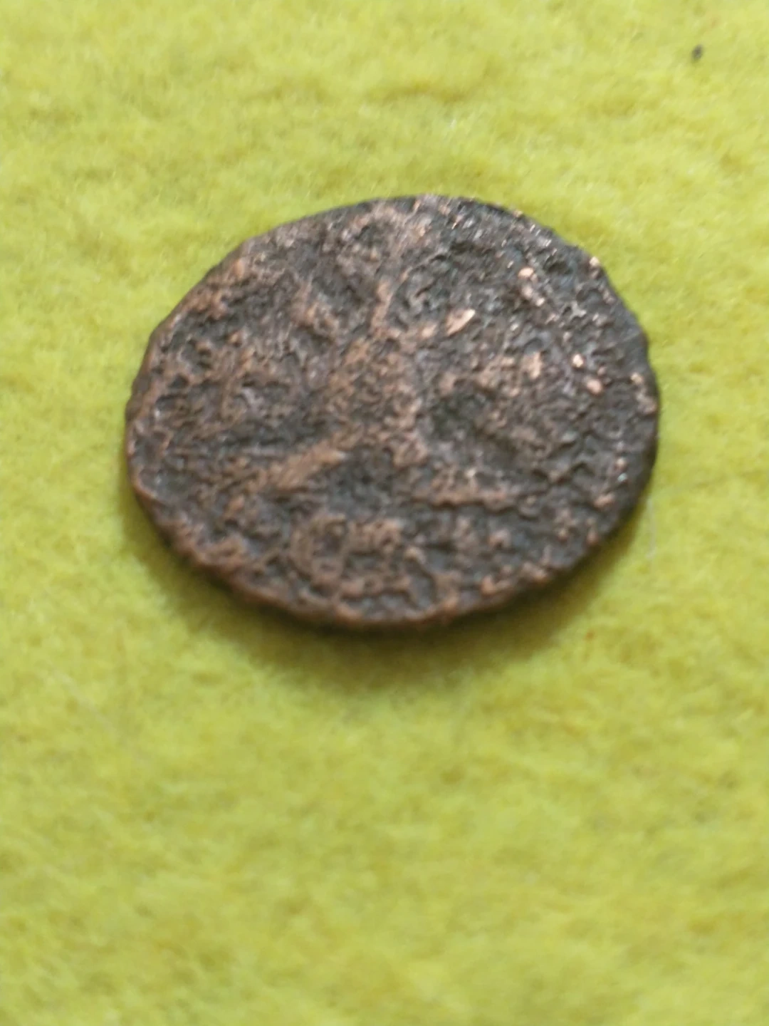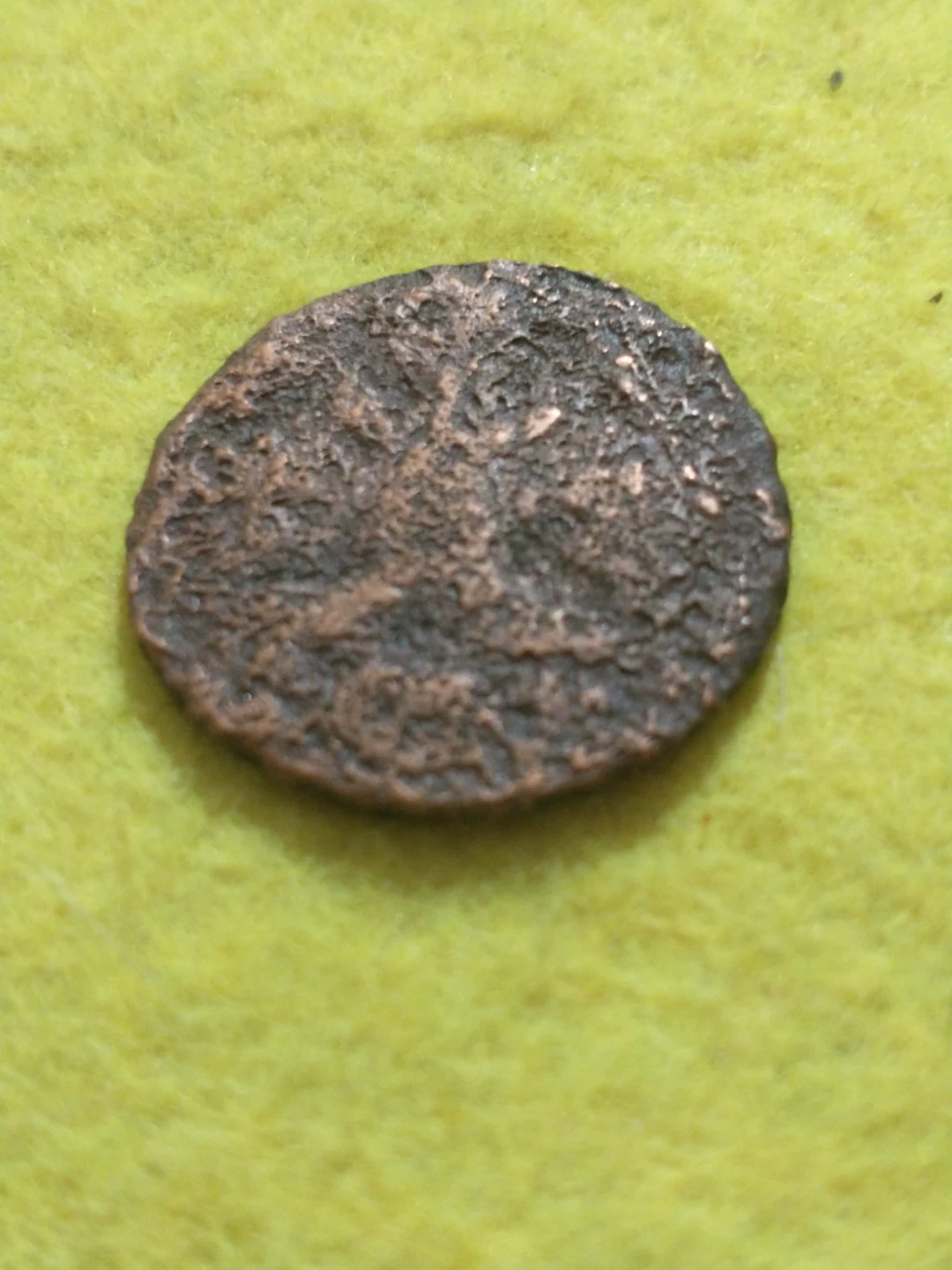 This is an old, weathered coin, likely made of copper or a similar alloy. The markings are worn but suggest historical significance. It's a tangible piece of the past.