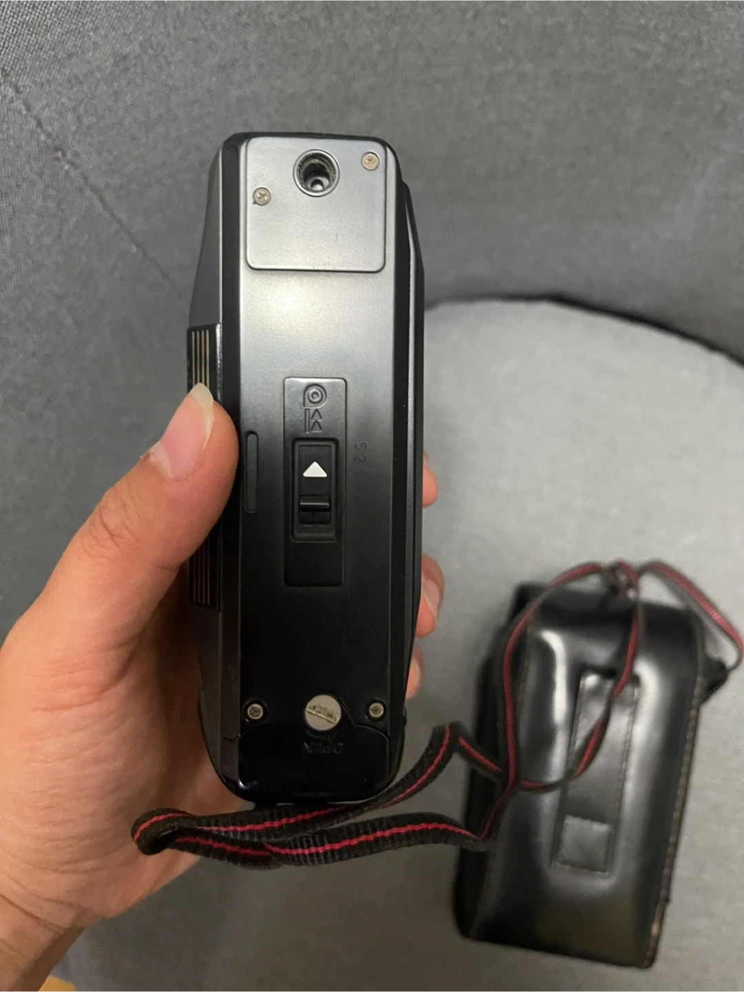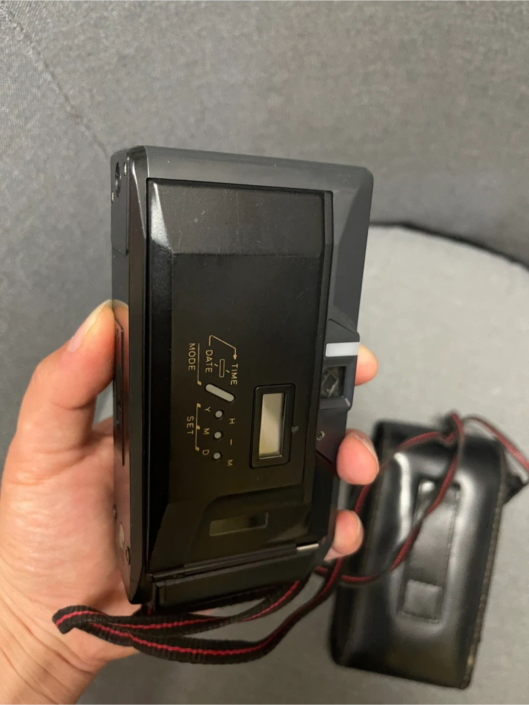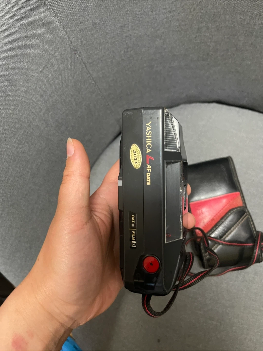 This is a Yashica film camera. It comes with a black and red Yashica leather case.