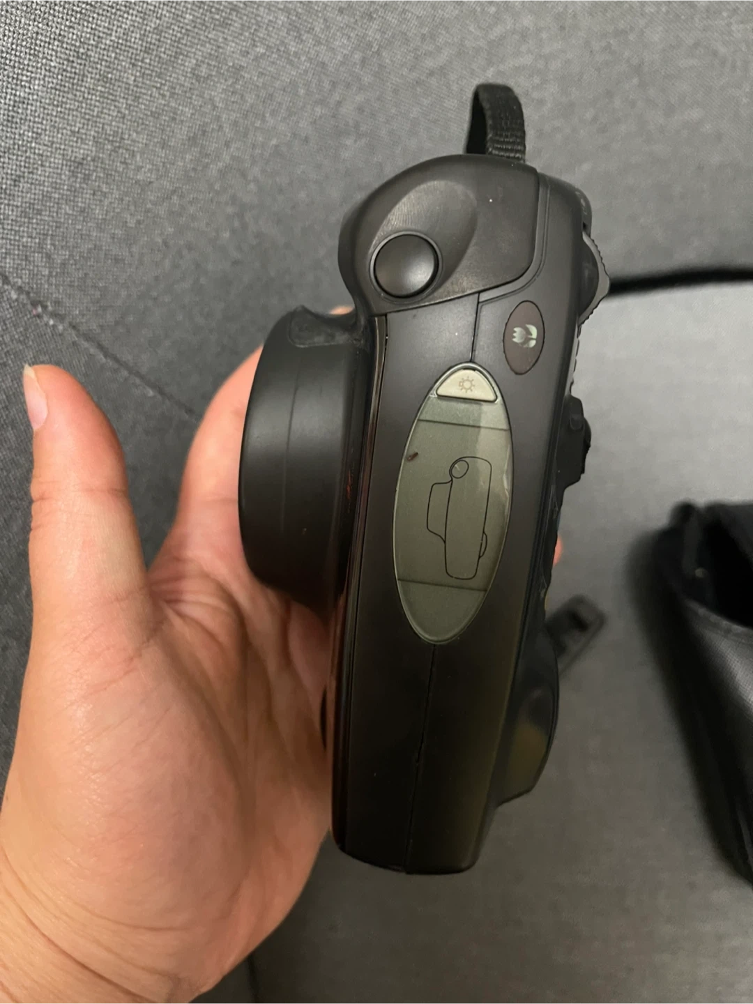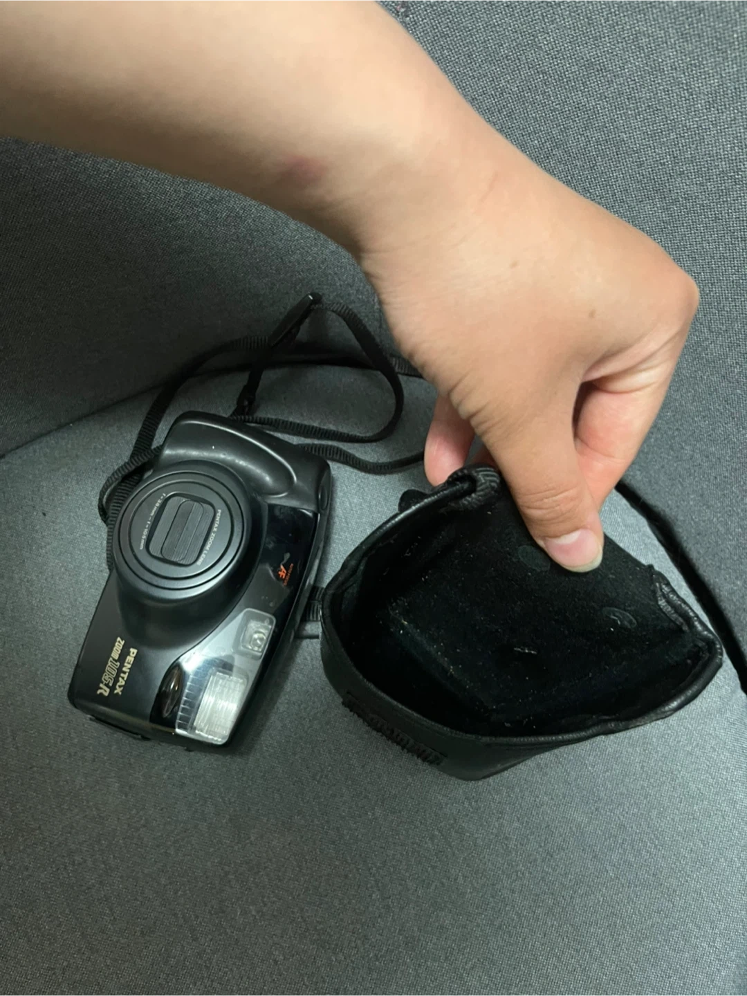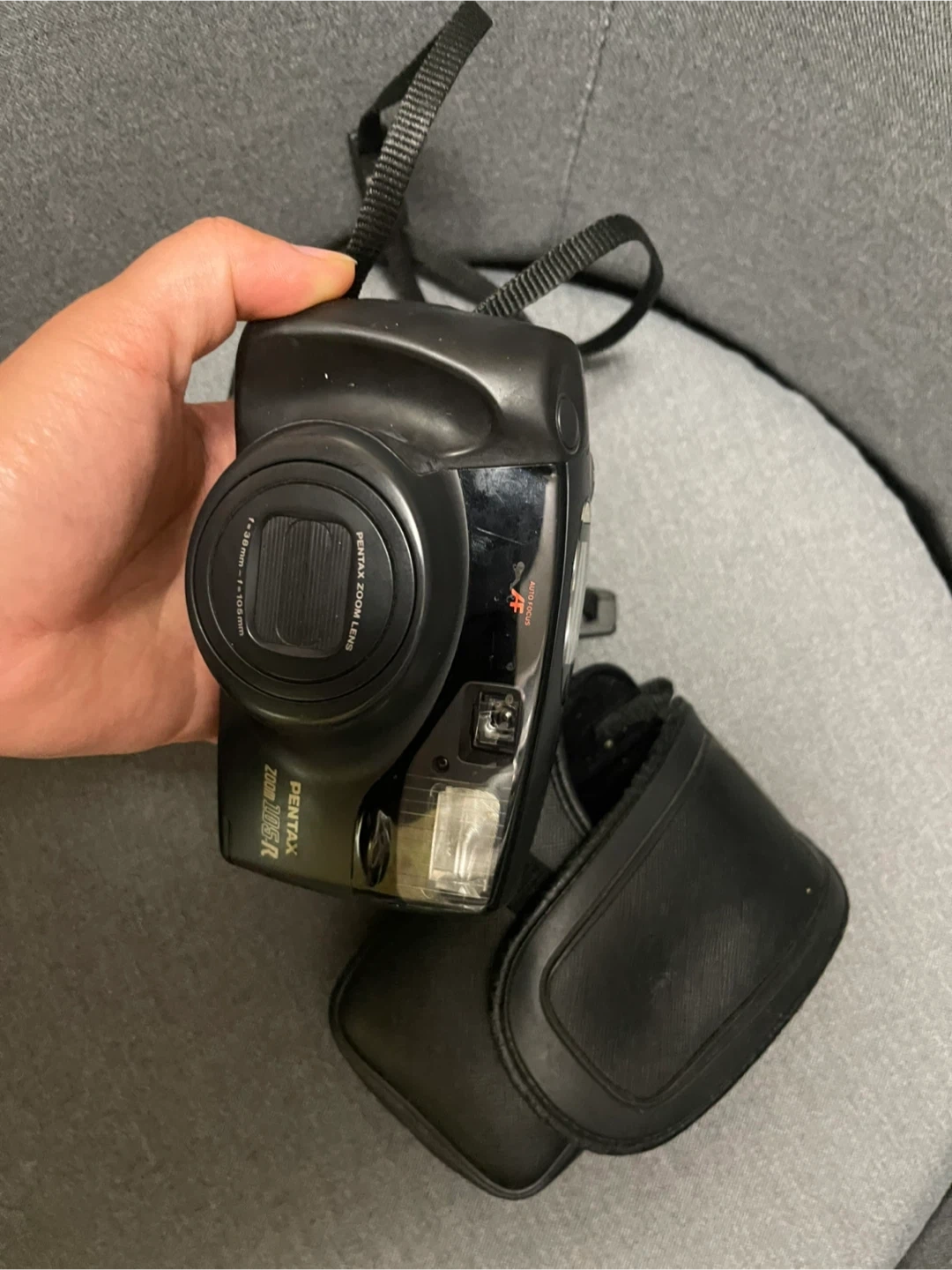This is a Pentax Zoom 105-R 35mm film camera with a 38mm-105mm zoom lens. It comes with a black carrying case and strap.
