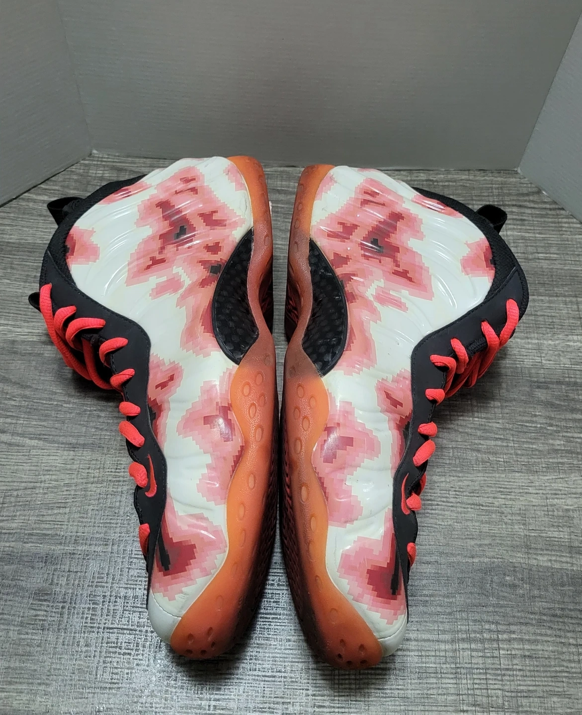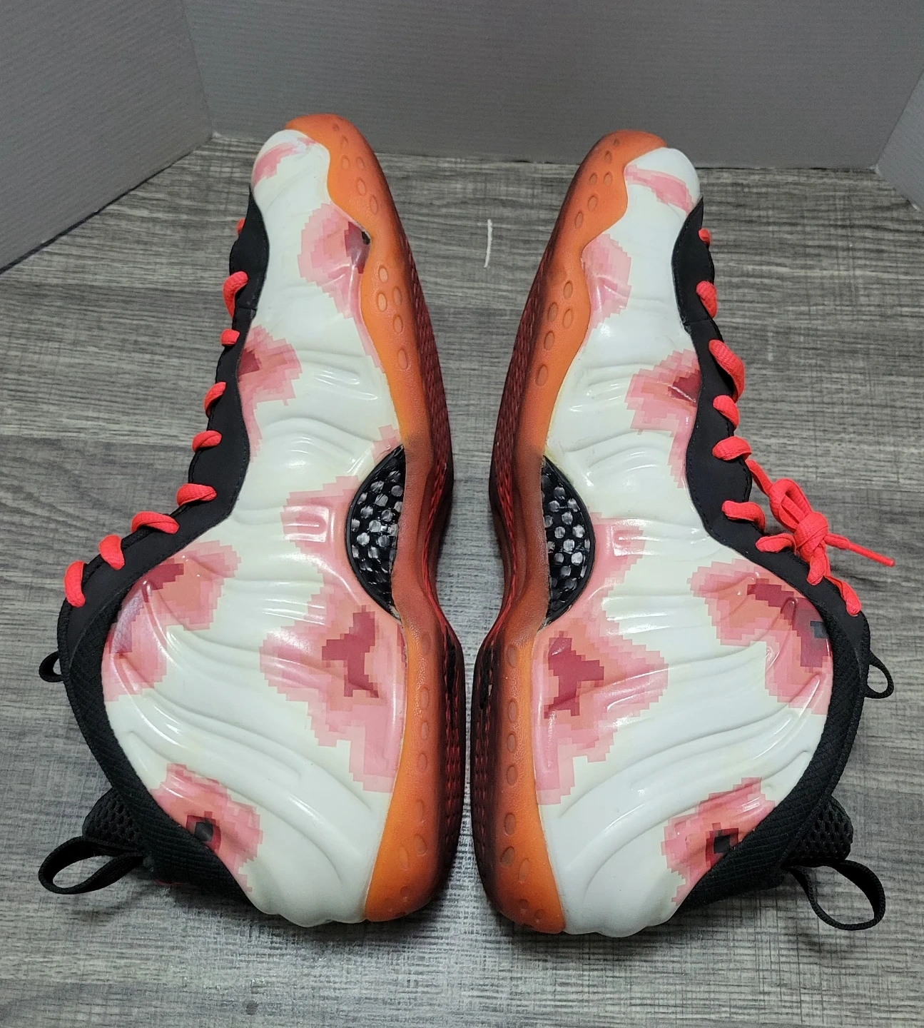 These Nike Air Foamposite One sneakers feature a white Foamposite shell with a red and pink pixelated floral pattern. They have black accents, red laces, and a bright orange translucent outsole. A unique design for any sneaker collector!