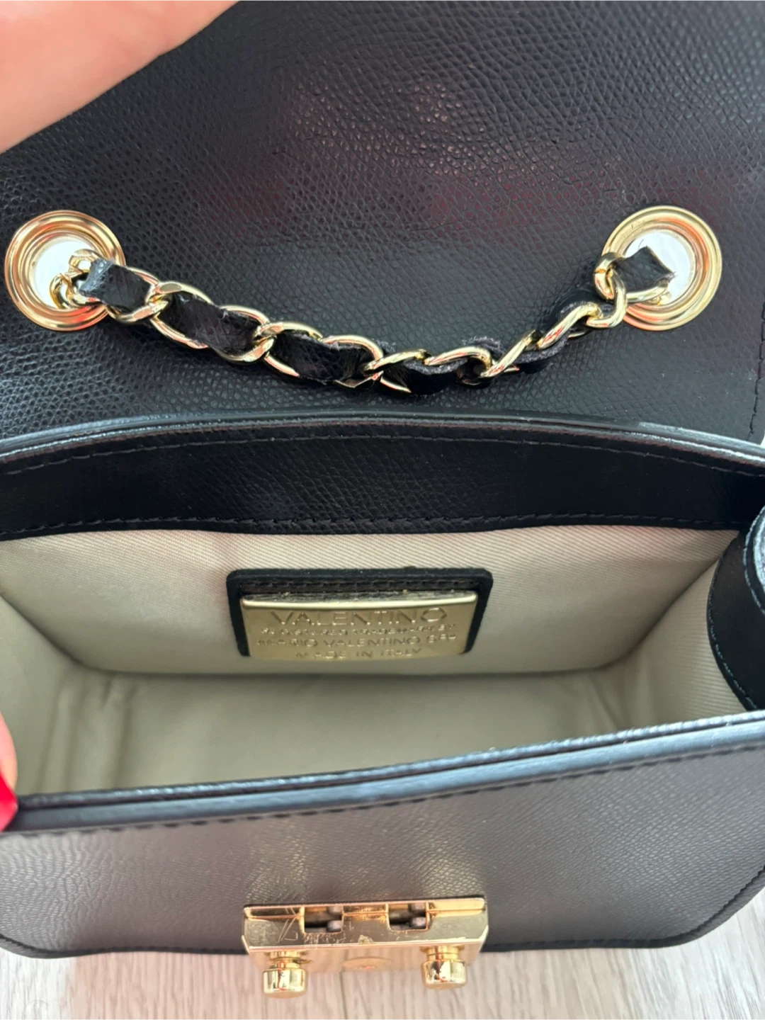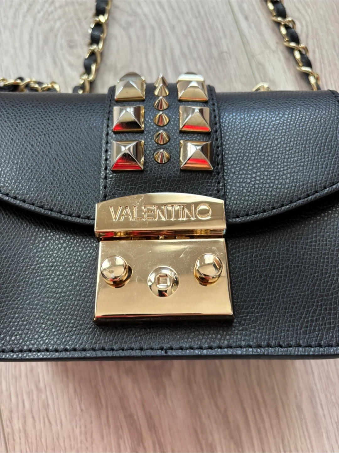 Stylish black crossbody bag with gold-tone hardware and studded detailing. Features a secure turn-lock closure and a chain strap. Interior has a logo plaque. A fashionable accessory for any occasion! Original price $1700 +Tax