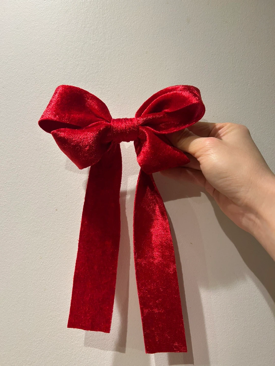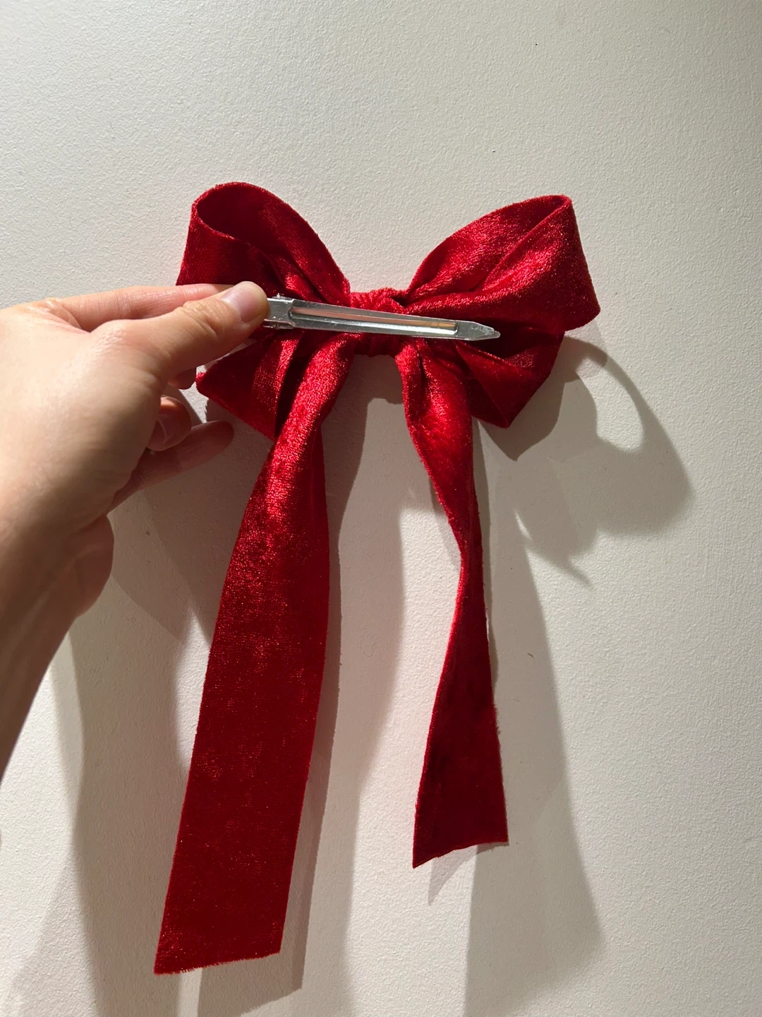 This is a festive red velvet bow, perfect for adding a touch of holiday cheer. It's attached to a sturdy metal clip for easy wear. Great for accessorizing hairstyles during any festivals!