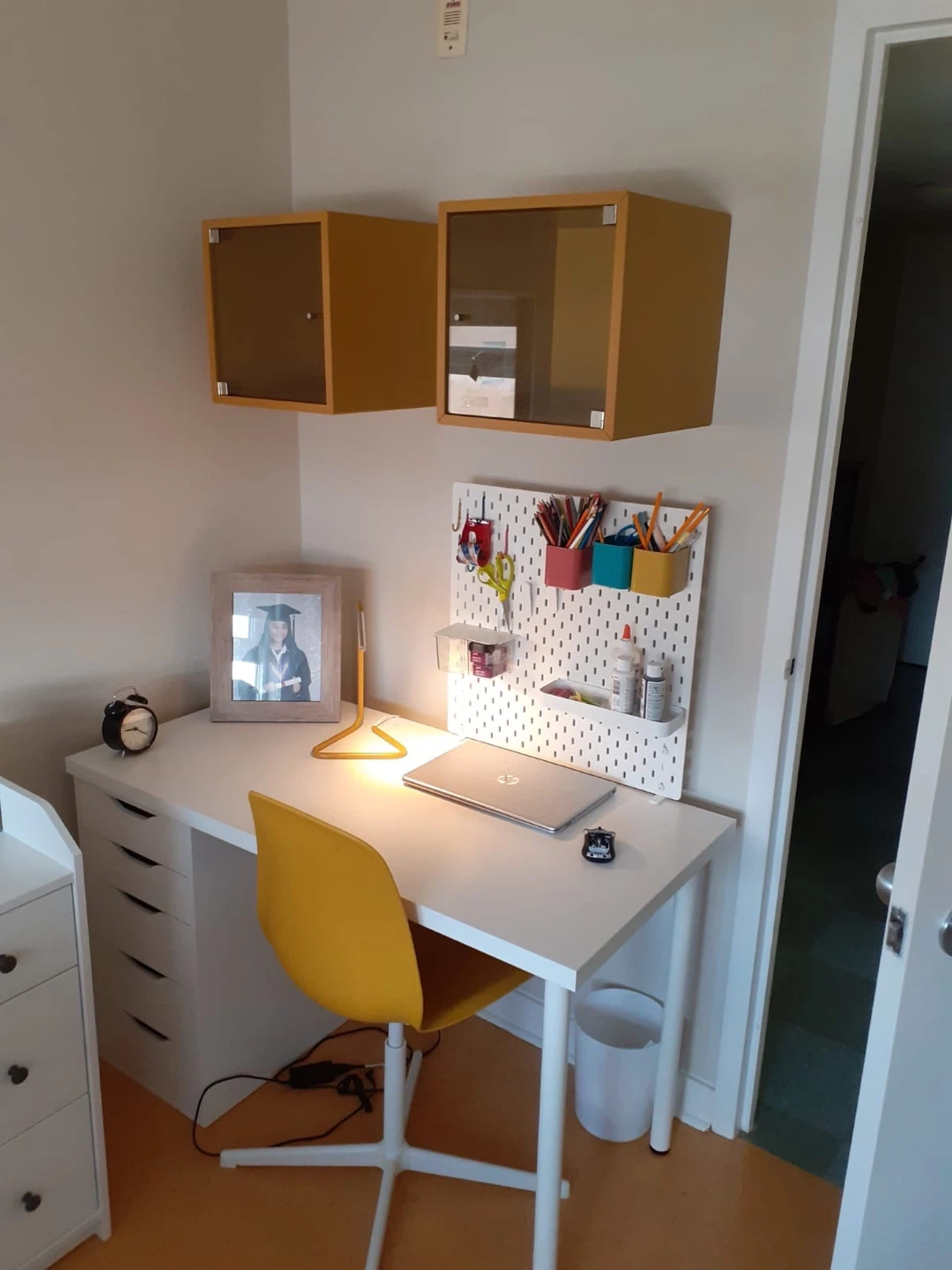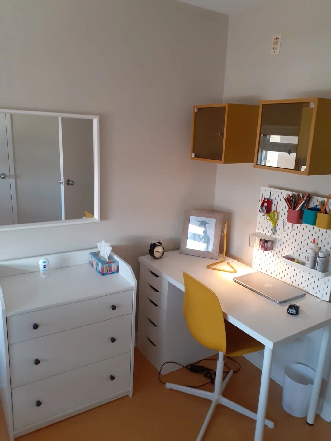 White Desk with Yellow Chair and Storage Unit