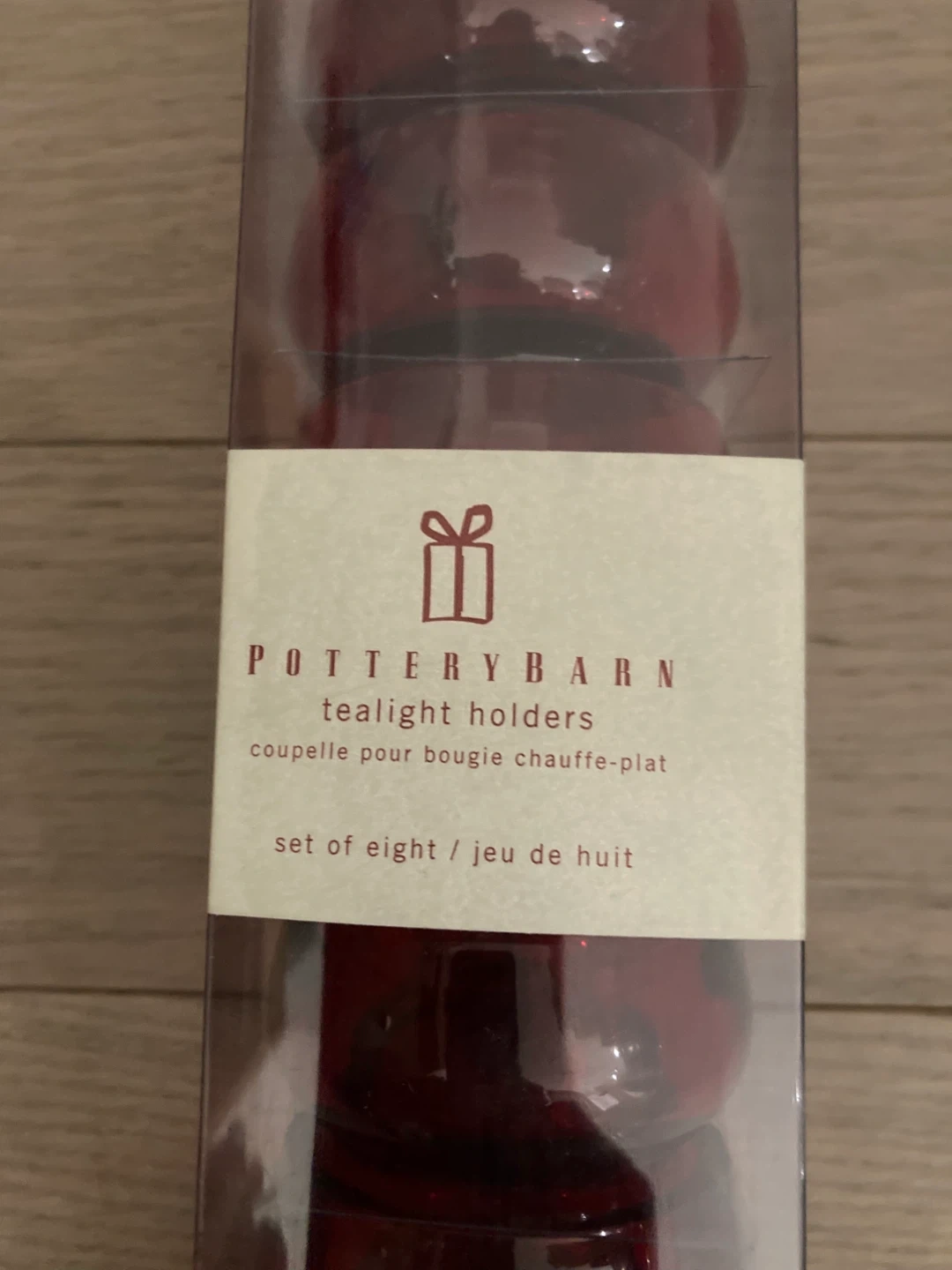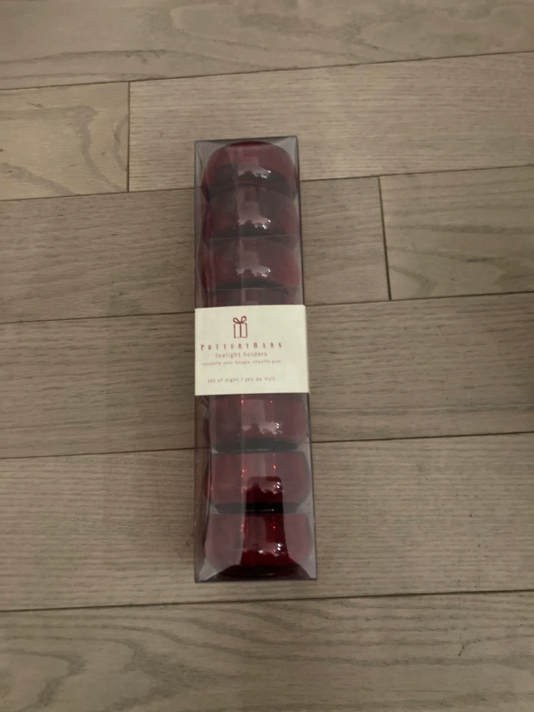 Used set of eight red tealight holders from Pottery Barn. These glass holders come in their original packaging. They're perfect for adding a festive glow to any space!