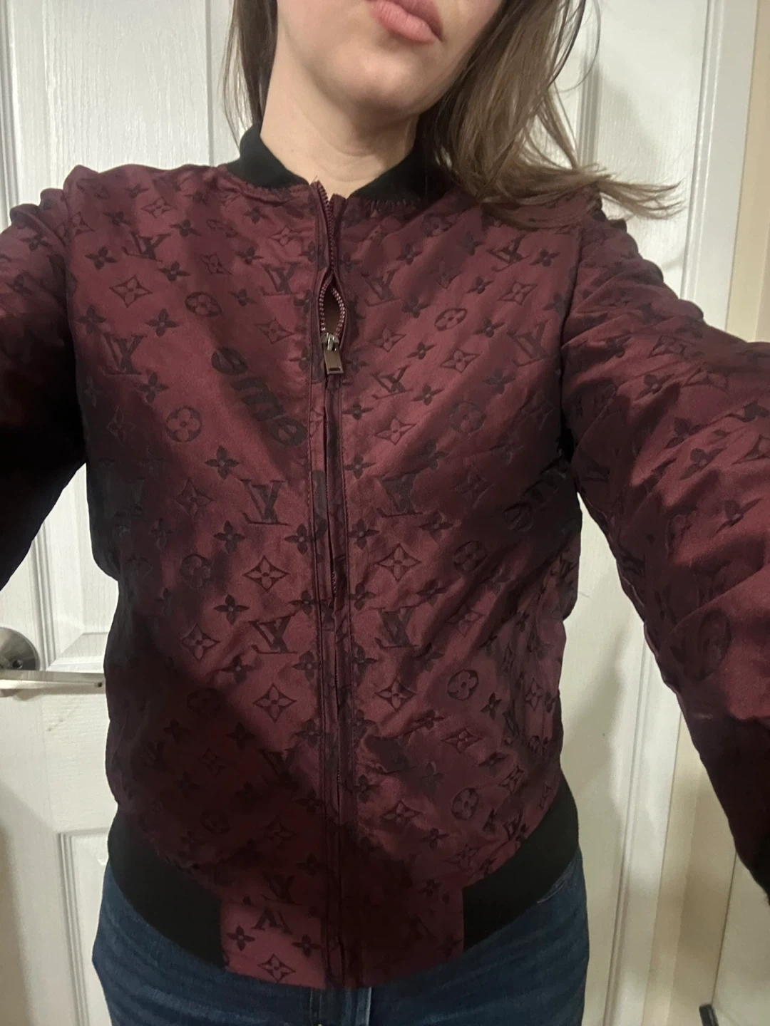 This is a Louis Vuitton x Supreme bomber jacket in a burgundy colour. It features the signature LV monogram print mixed with Supreme branding. Elasticated cuffs and hem. Zipper closure.