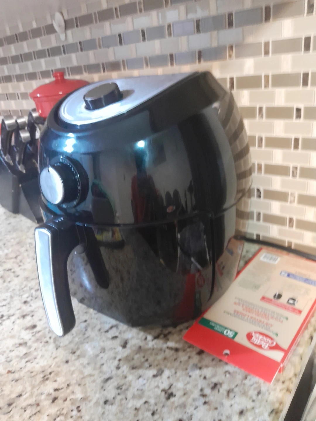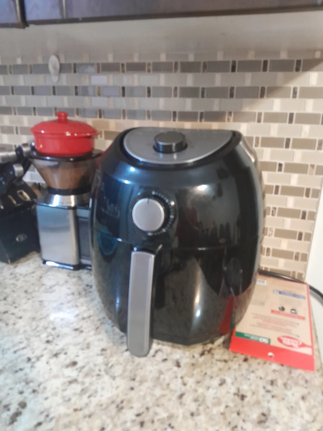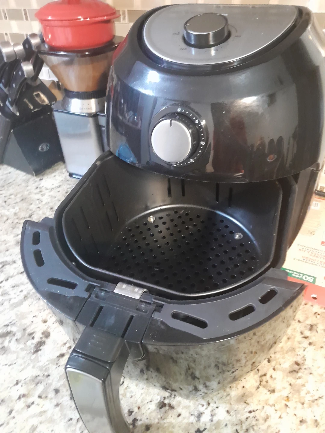 Black air fryer with adjustable temperature control and timer. It features a removable basket for easy cleaning. This appliance is great for quickly preparing crispy foods.