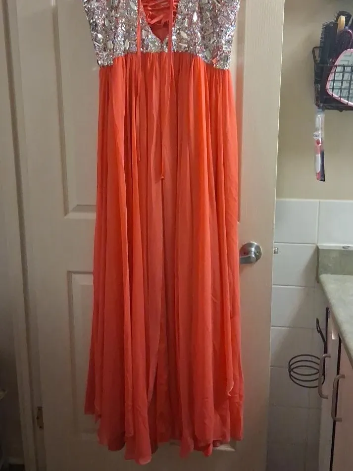 A stunning coral formal dress with a heavily beaded halter neckline. It features a flowing chiffon skirt and a lace-up back detail. This dress is perfect for proms, weddings, or any special occasion!