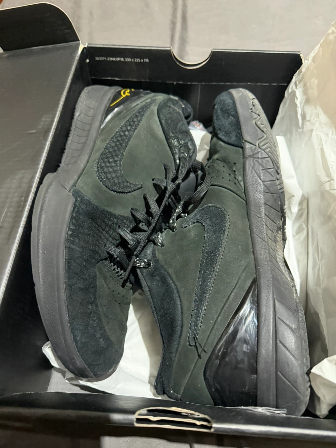 Black Nike basketball shoes are included in their original box. These sneakers feature a durable rubber sole and a lace-up closure. They're made with a mix of suede and synthetic materials.