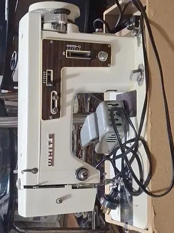 This is a White brand sewing machine. It features a retro design with wood-grain accents. It includes a motor and power cord.