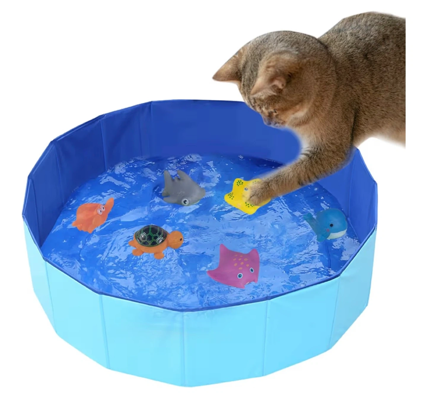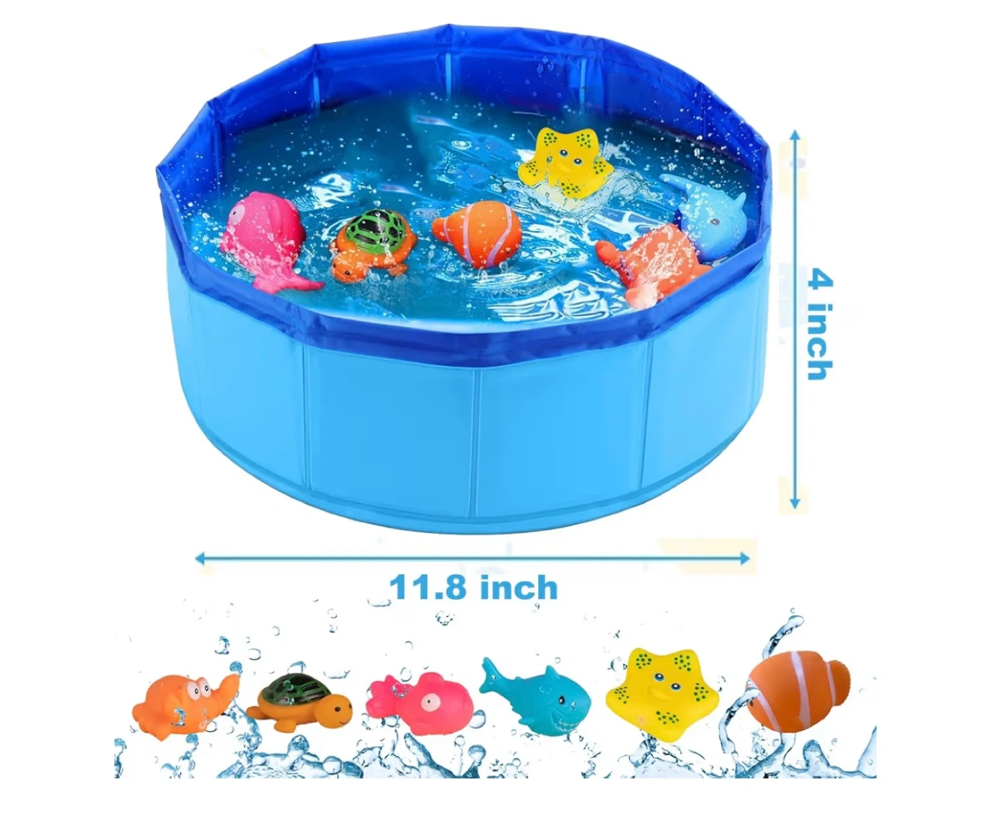 This foldable pet pool comes with 6 different water toys for your furry friend to enjoy. It's 4 inches tall and 11.8 inches wide. Great for keeping pets entertained during bath time!