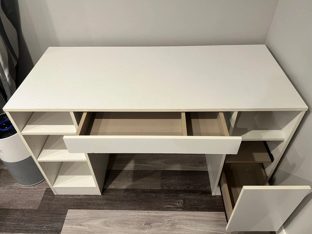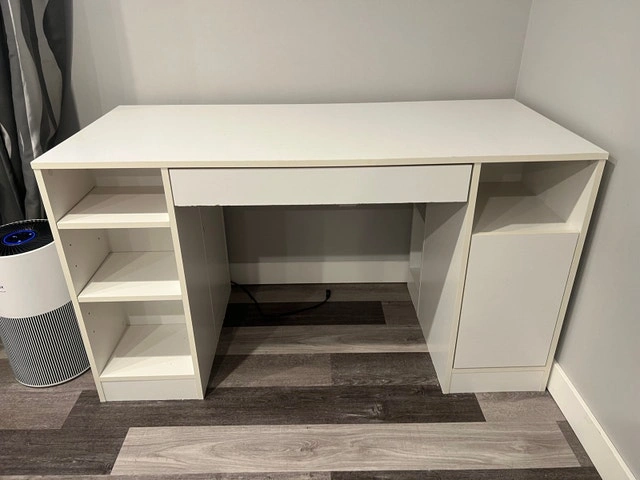 Great desk with lots of storage! Assembly is very easy and it is easy to move as it separates into 3 separate sections or you can take it all part. There is a few little marks.