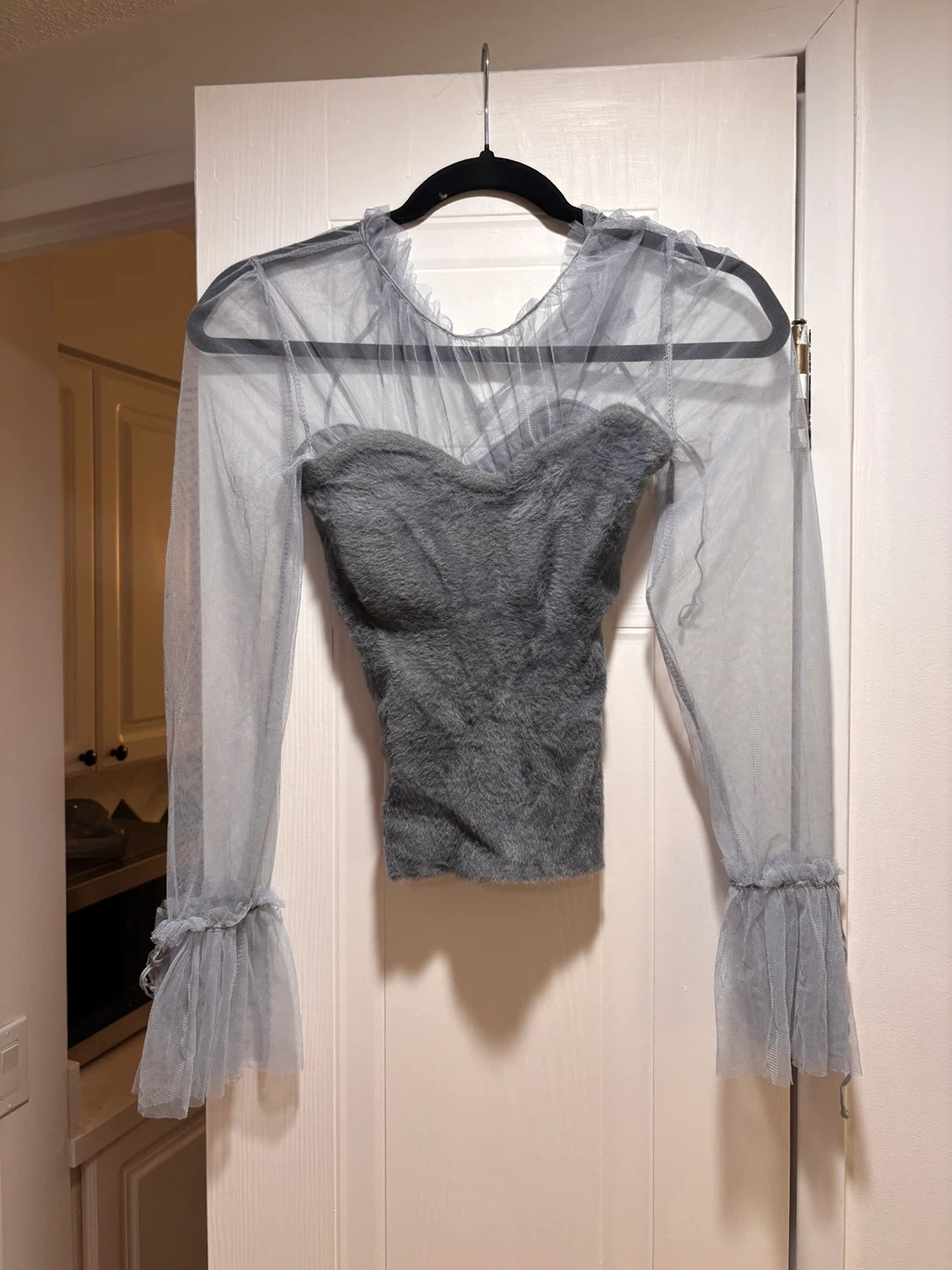 Grey mesh long-sleeve top with a faux fur corset detail. It has ruffled cuffs and neckline. Made in Korea.