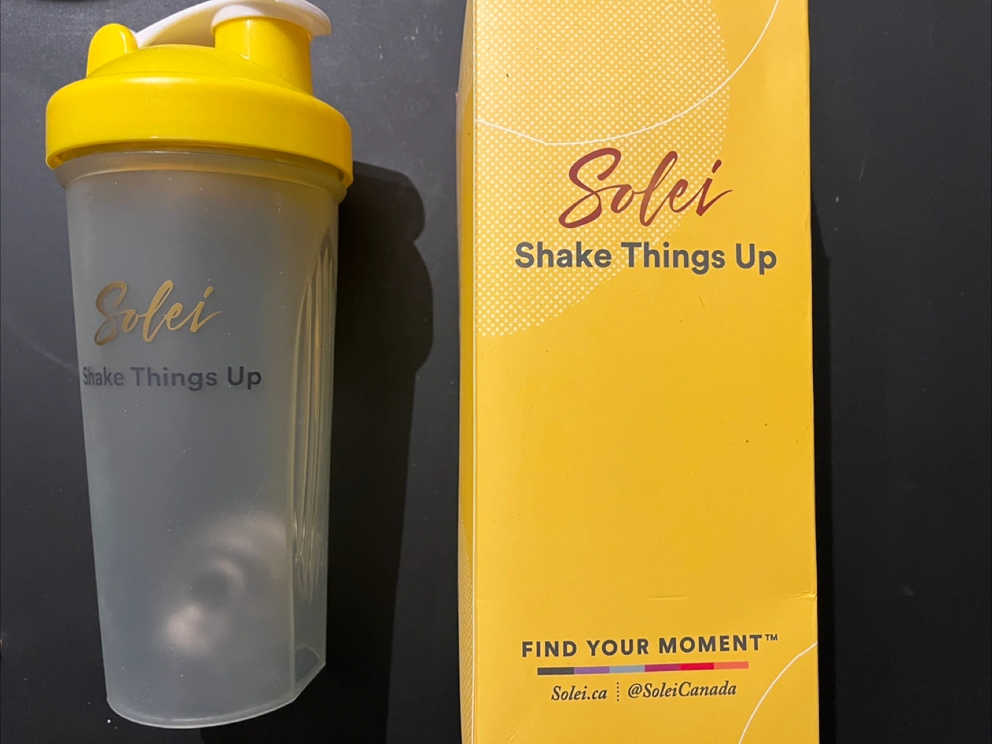 This is a Solei shaker bottle with the "Shake Things Up" branding. It comes with its original box. The bottle is made of translucent plastic with a yellow lid and flip-top spout. Never used.