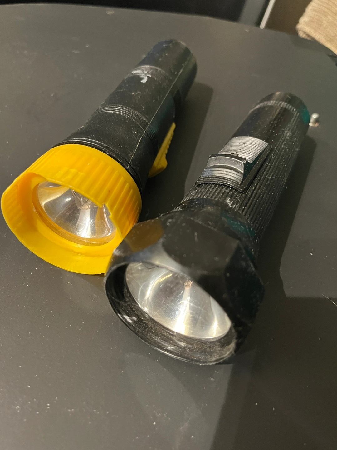 Giving away a set of two flashlights. One is black with a silver switch, and the other features a black body with a bright yellow end cap. Both are made of plastic and metal components.