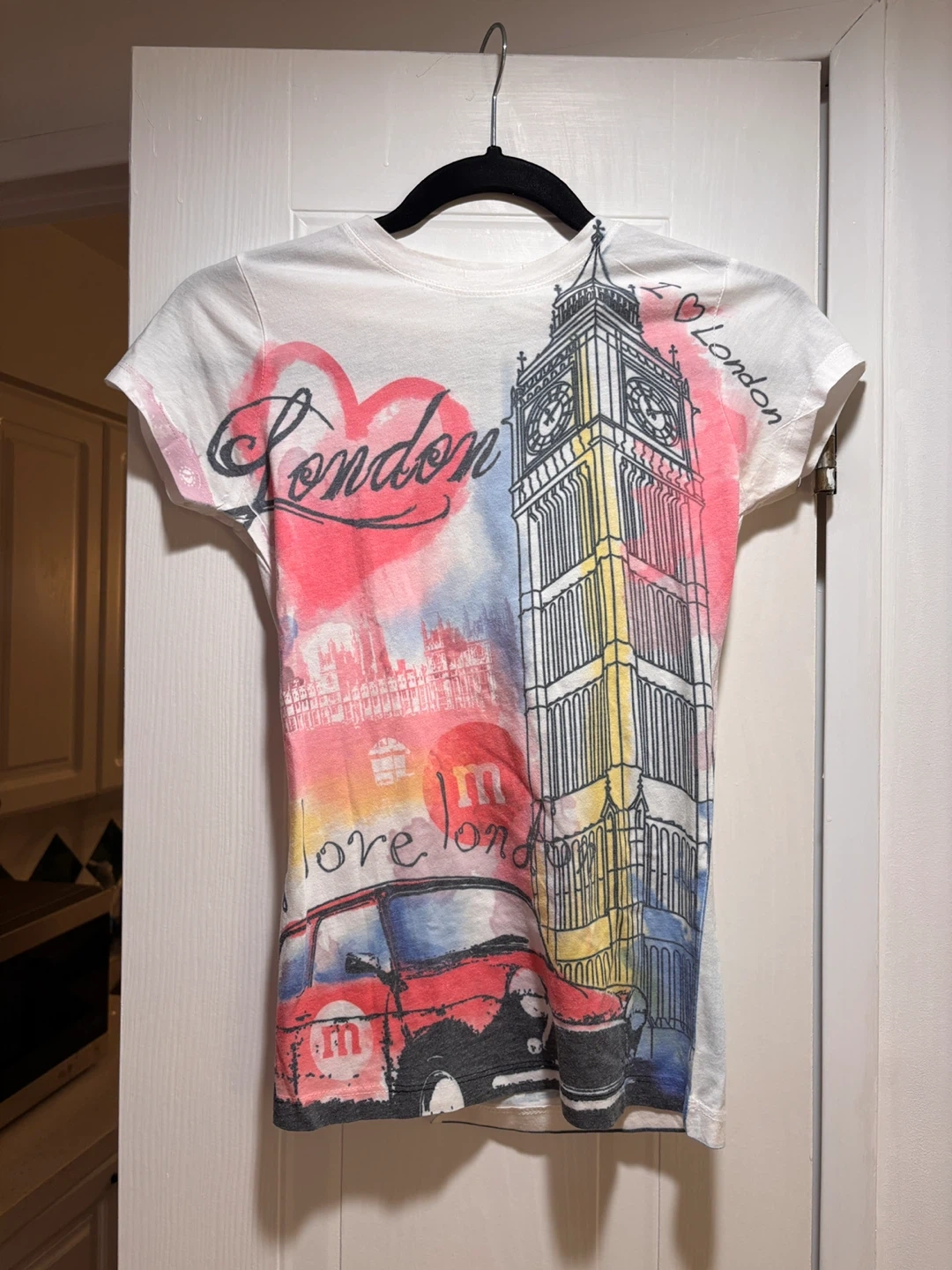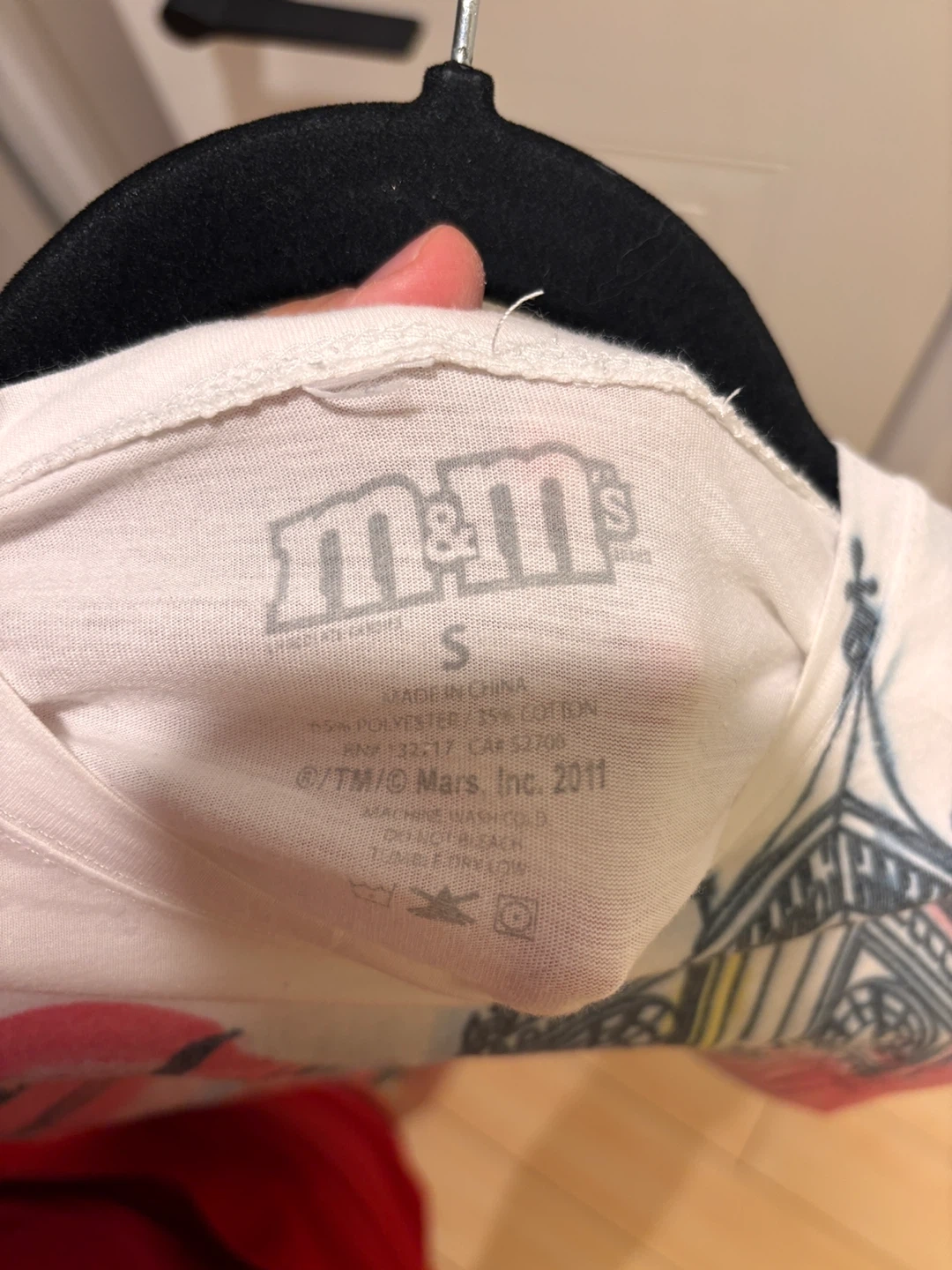 This is a white M&M's graphic t-shirt with a London theme. It's made from a 65% polyester and 35% cotton blend. This shirt is a size small.