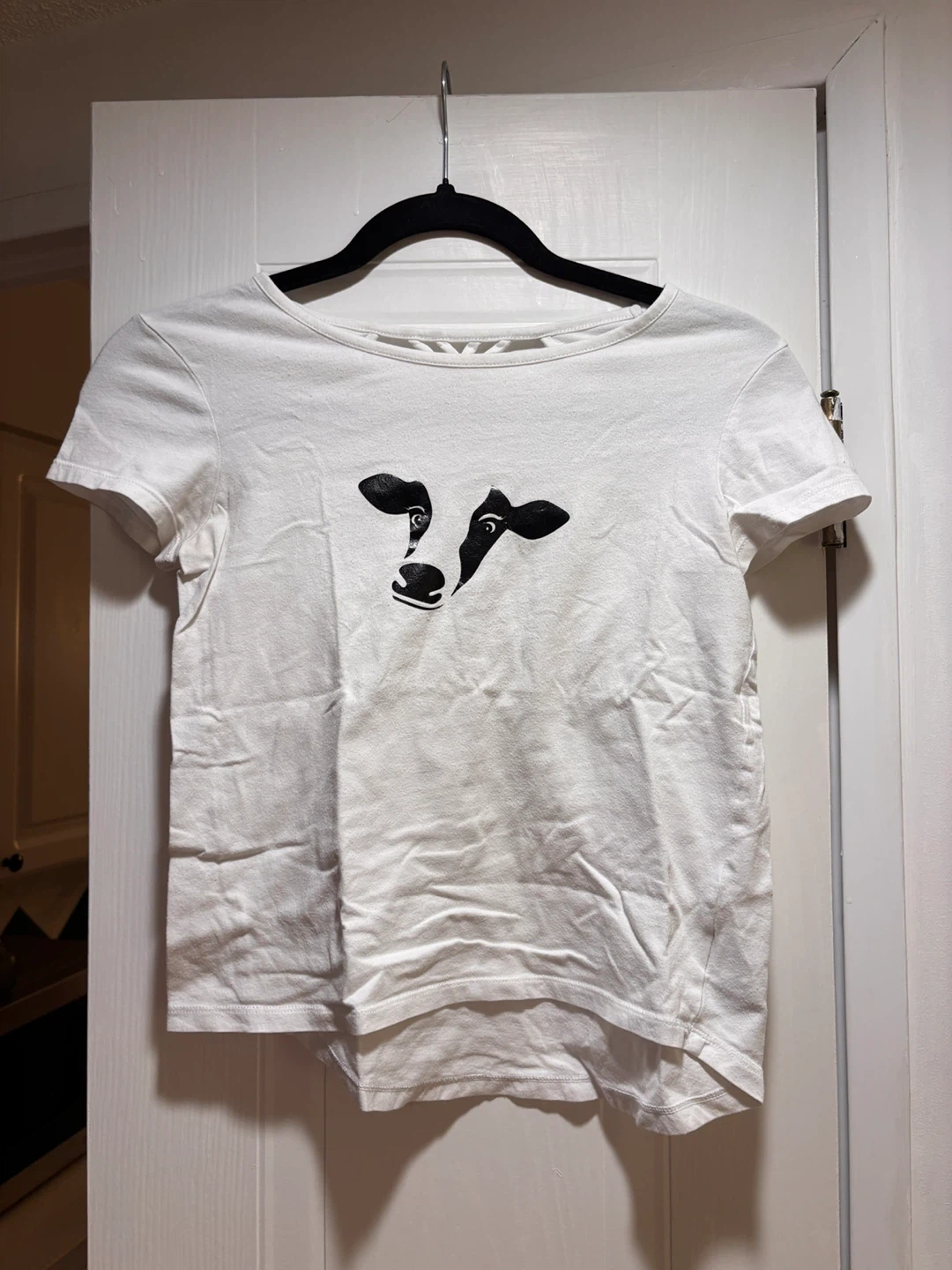 This is a white t-shirt with a cow graphic on the front. It has a criss-cross detail at the back neckline. Made from soft, breathable fabric.