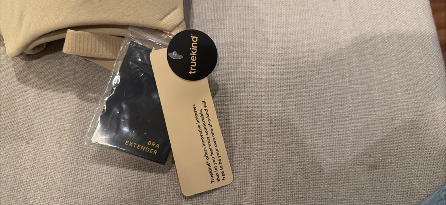This Truekind bra offers supportive comfort and a wireless shaping design. It's made with 63% recycled polyamide, 38% polyamide, and 9% elastane. Includes a bra extender for added versatility.