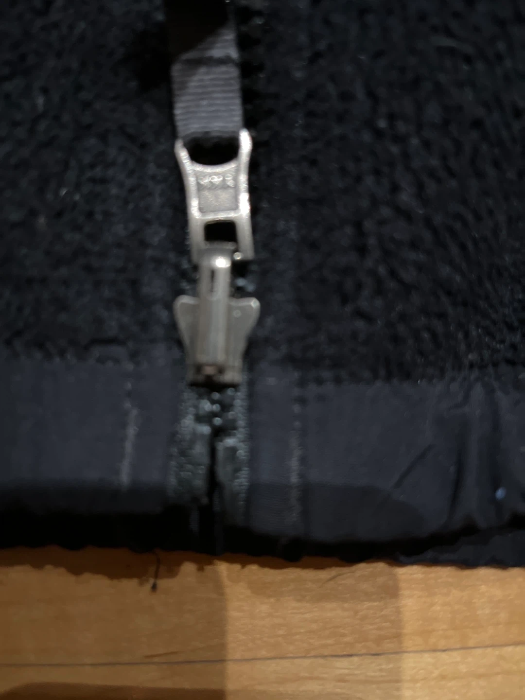 This is a black fleece jacket from The North Face. It's a boys' size S/P. The jacket is made of fleece material with nylon panels on the shoulders and sleeves. It features a full zip front and two zippered hand pockets. There’s a zipper damage on the bottom, but zipper can still fully close as seen in the picture and can be fix.