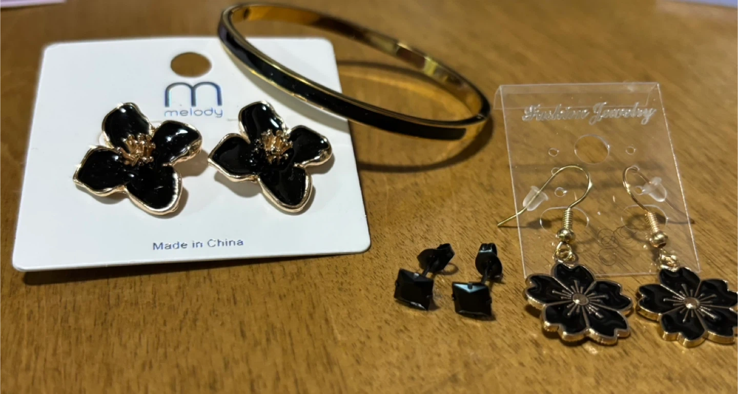 This set includes a pair of Melody flower stud earrings and a separate pair of flower dangle earrings. It also comes with a gold-tone bangle bracelet accented with black enamel and rhinestone black studs. Perfect for adding a touch of floral elegance to any outfit!
