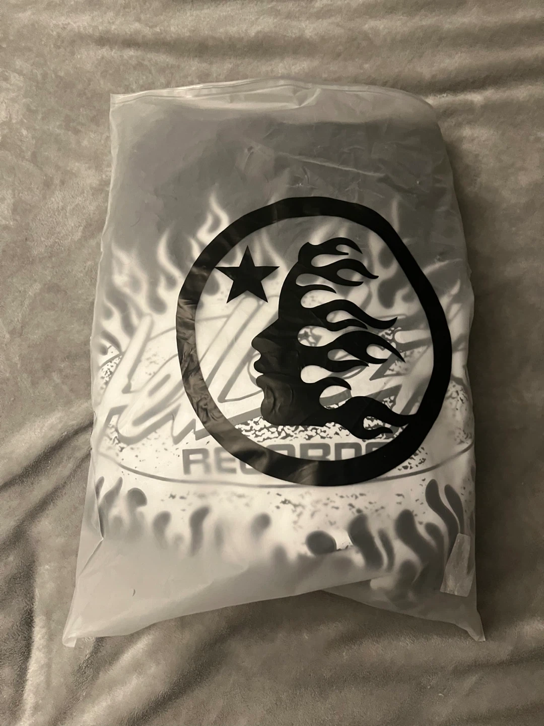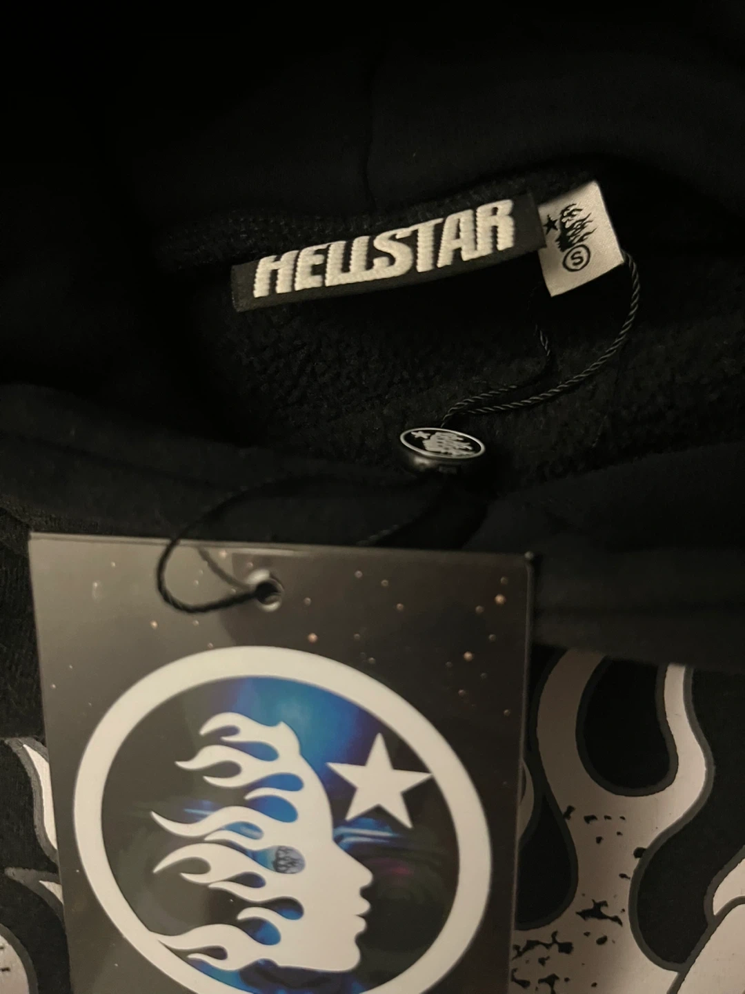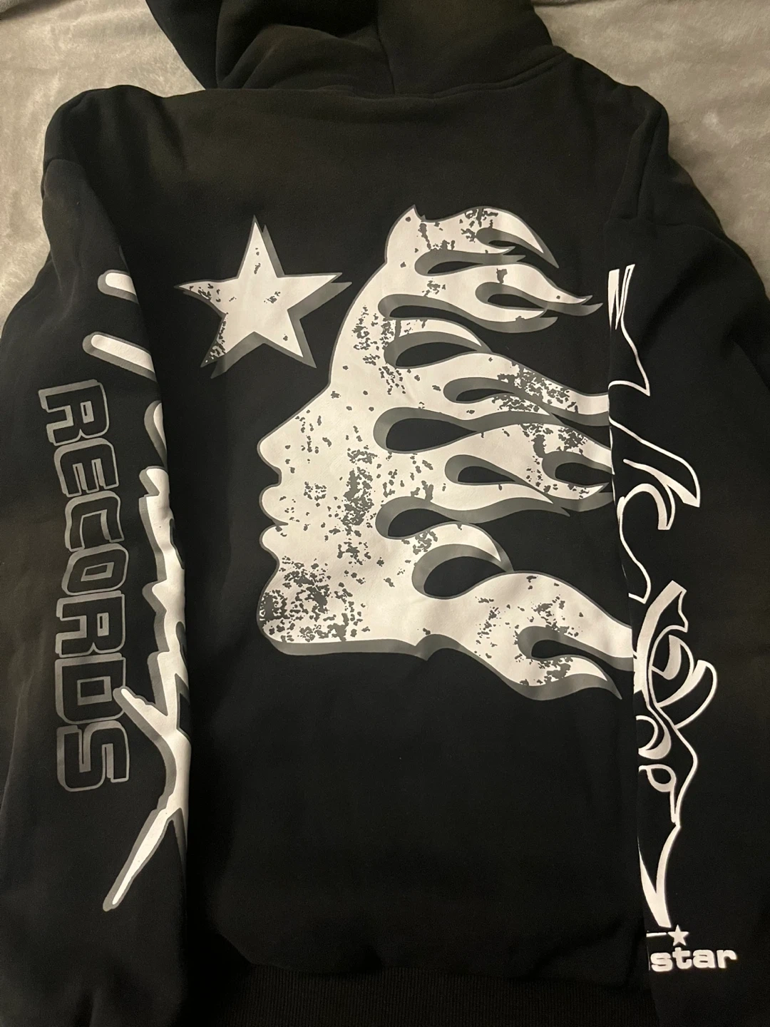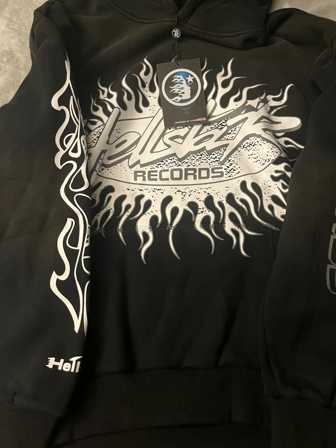 Black Hellstar Records hoodie with flame graphic. Features a pull-string hood and long sleeves. Size is small.