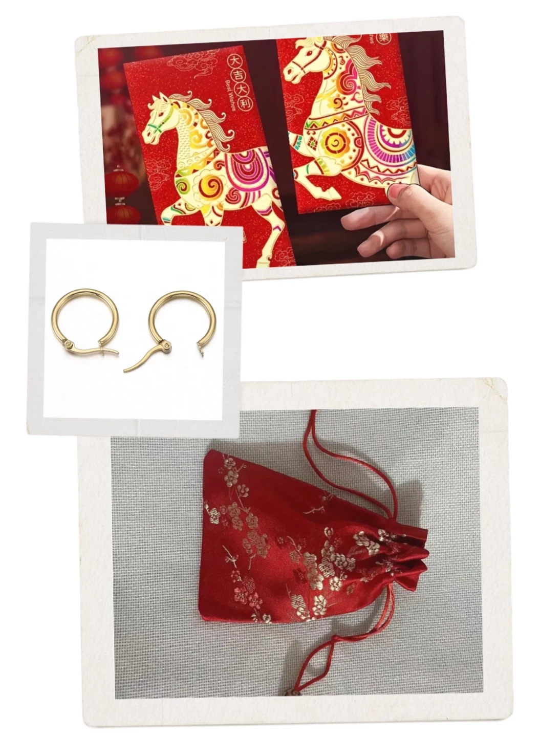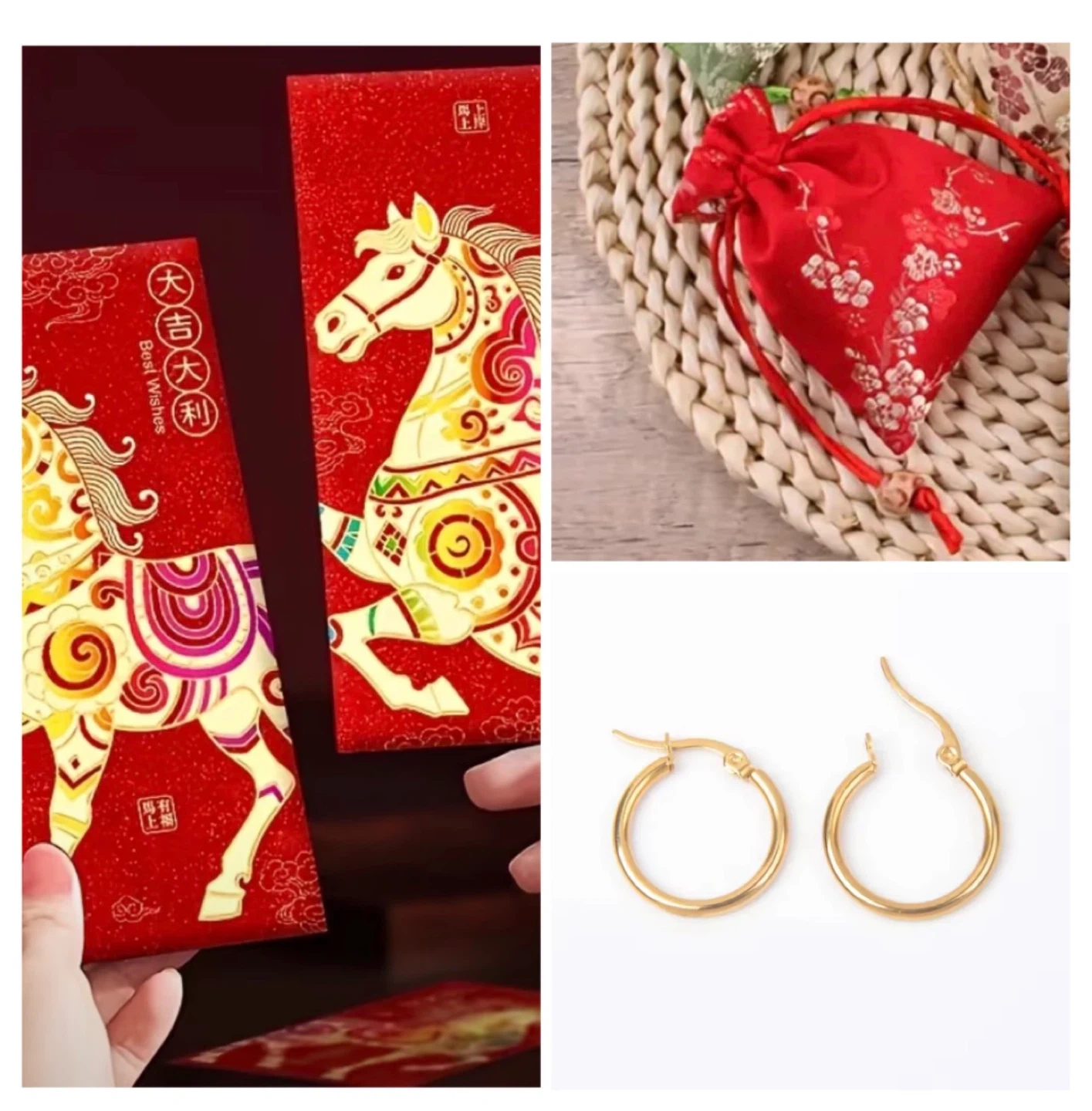 2 Horse Red Envelopes+ Embroidered Silk Pouch+ Earrings