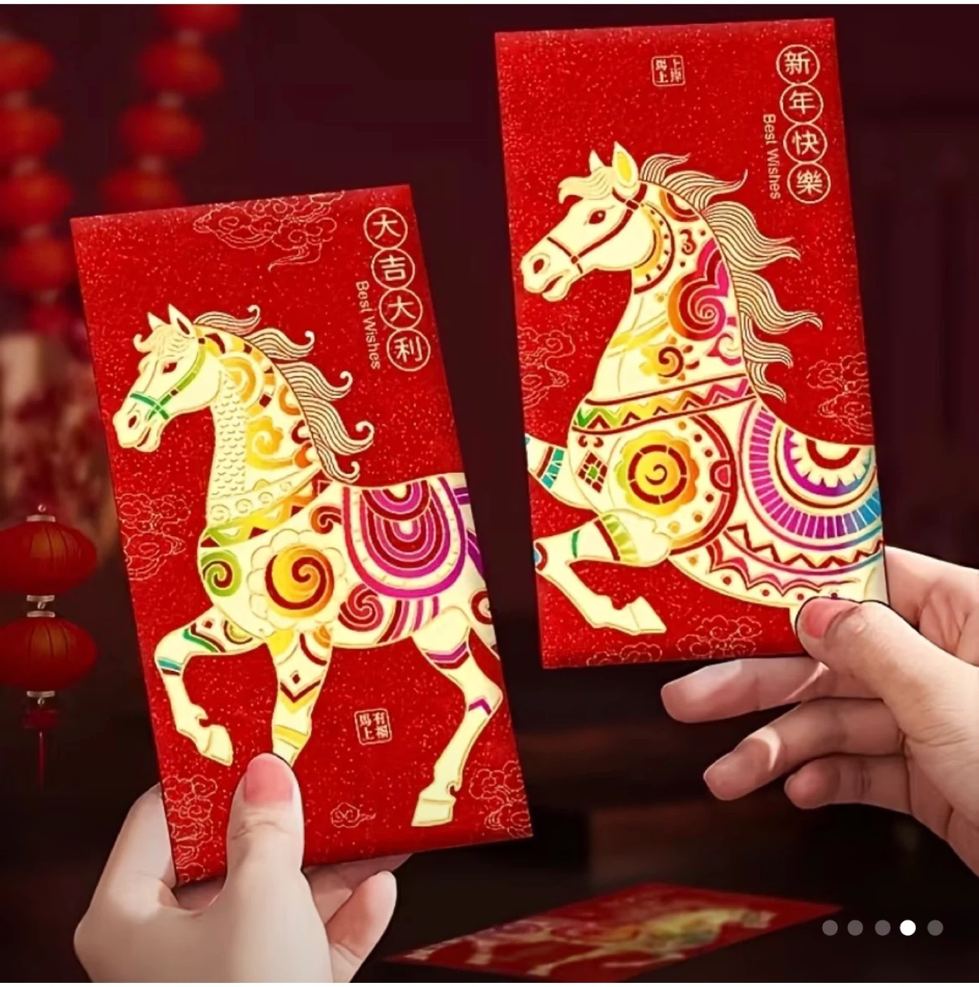 ✨ Two red envelopes featuring golden horse designs – symbols of prosperity and good fortune