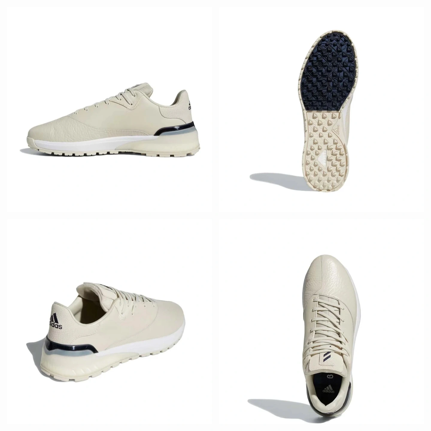 These are Adidas Rebelcross spikeless golf shoes in a light beige colour. They're made for performance on the course. The spikeless design offers versatility for wear on and off the green.