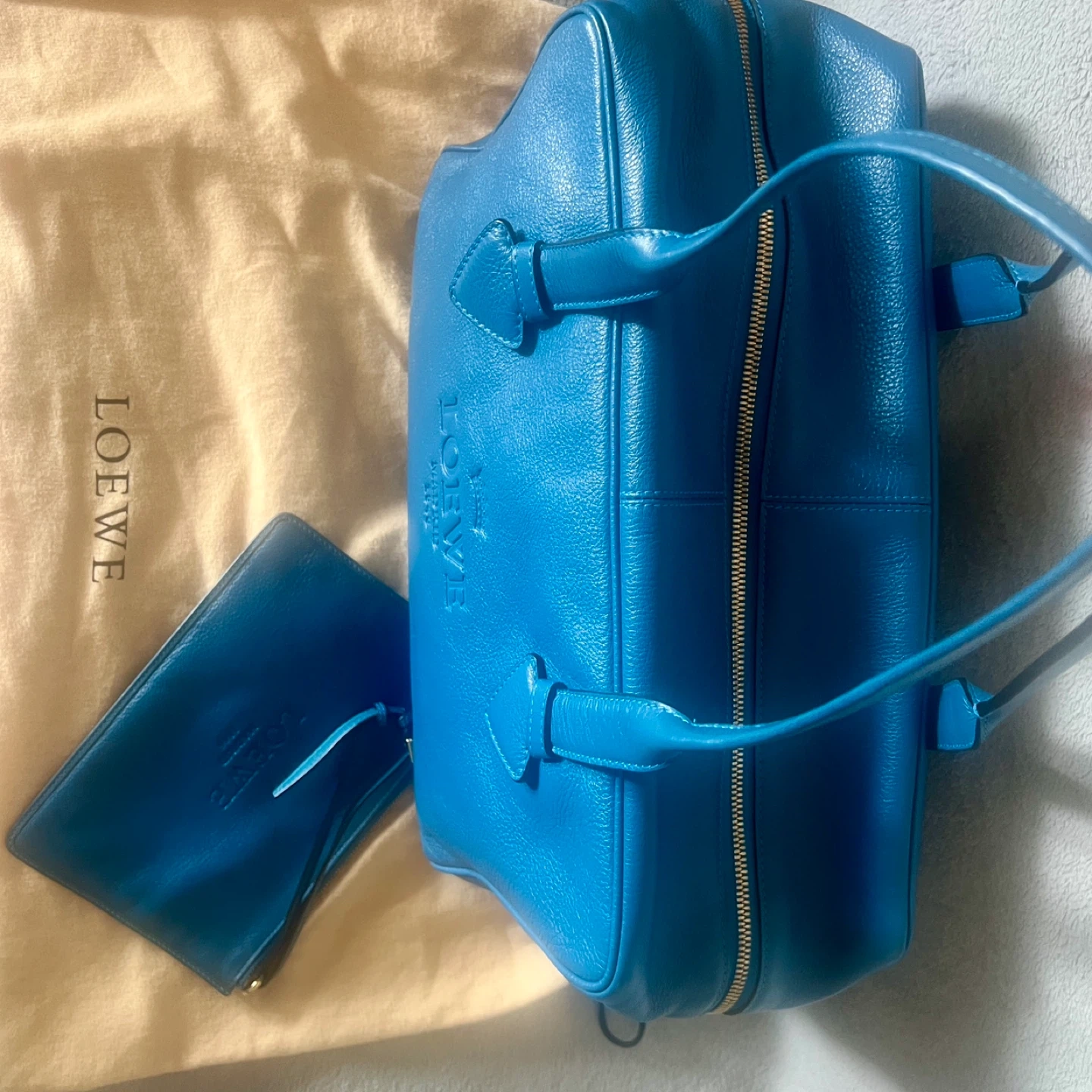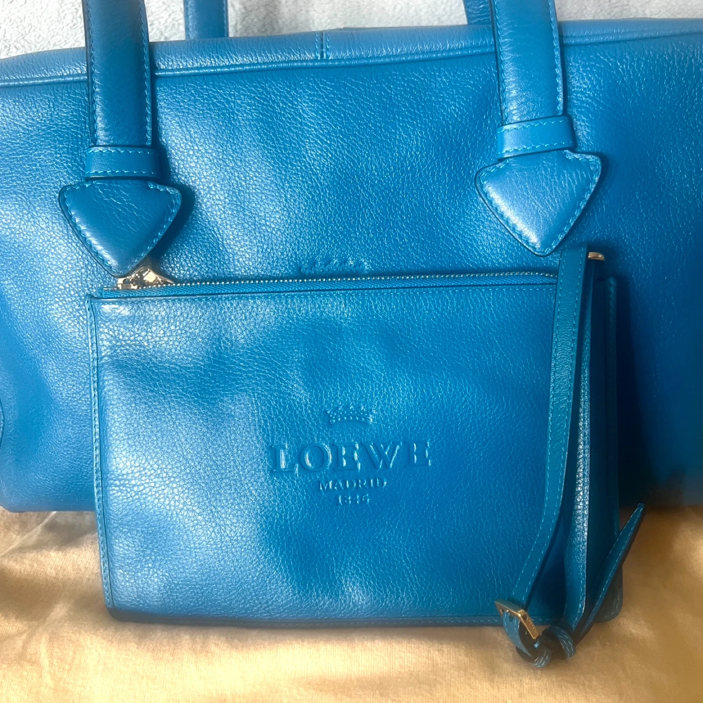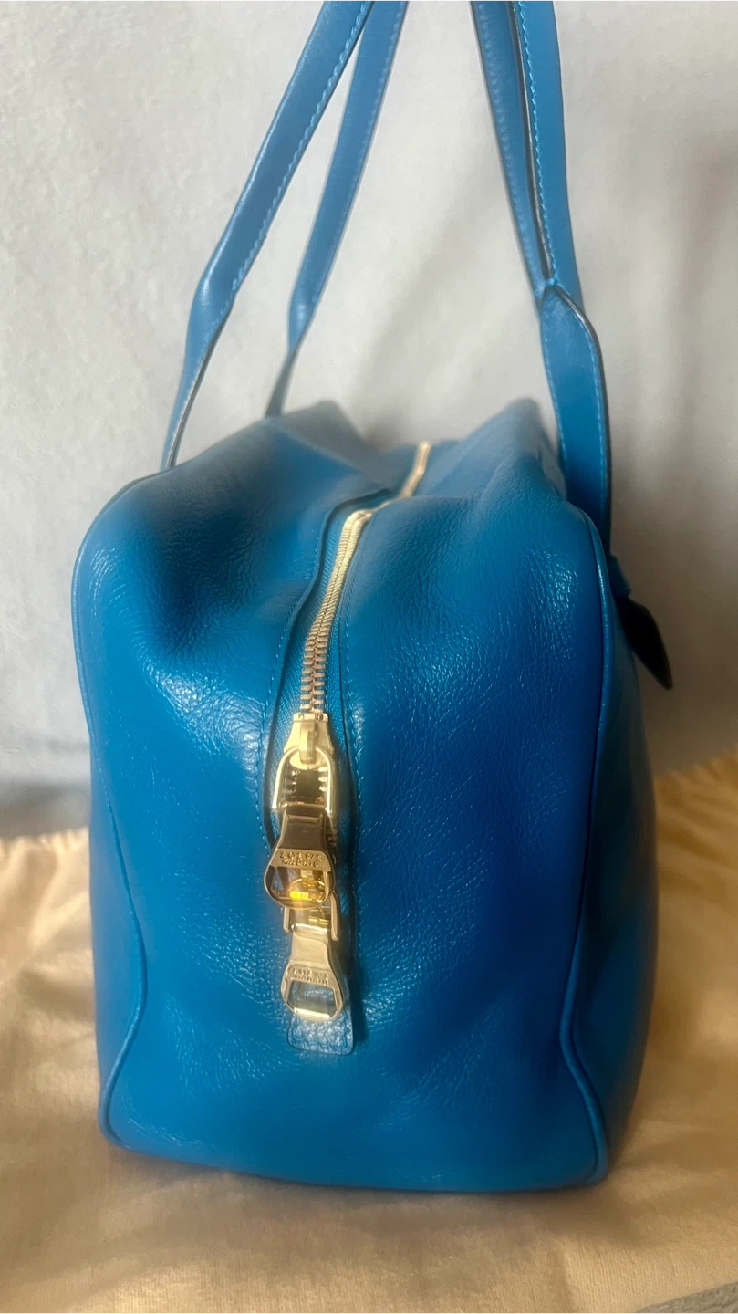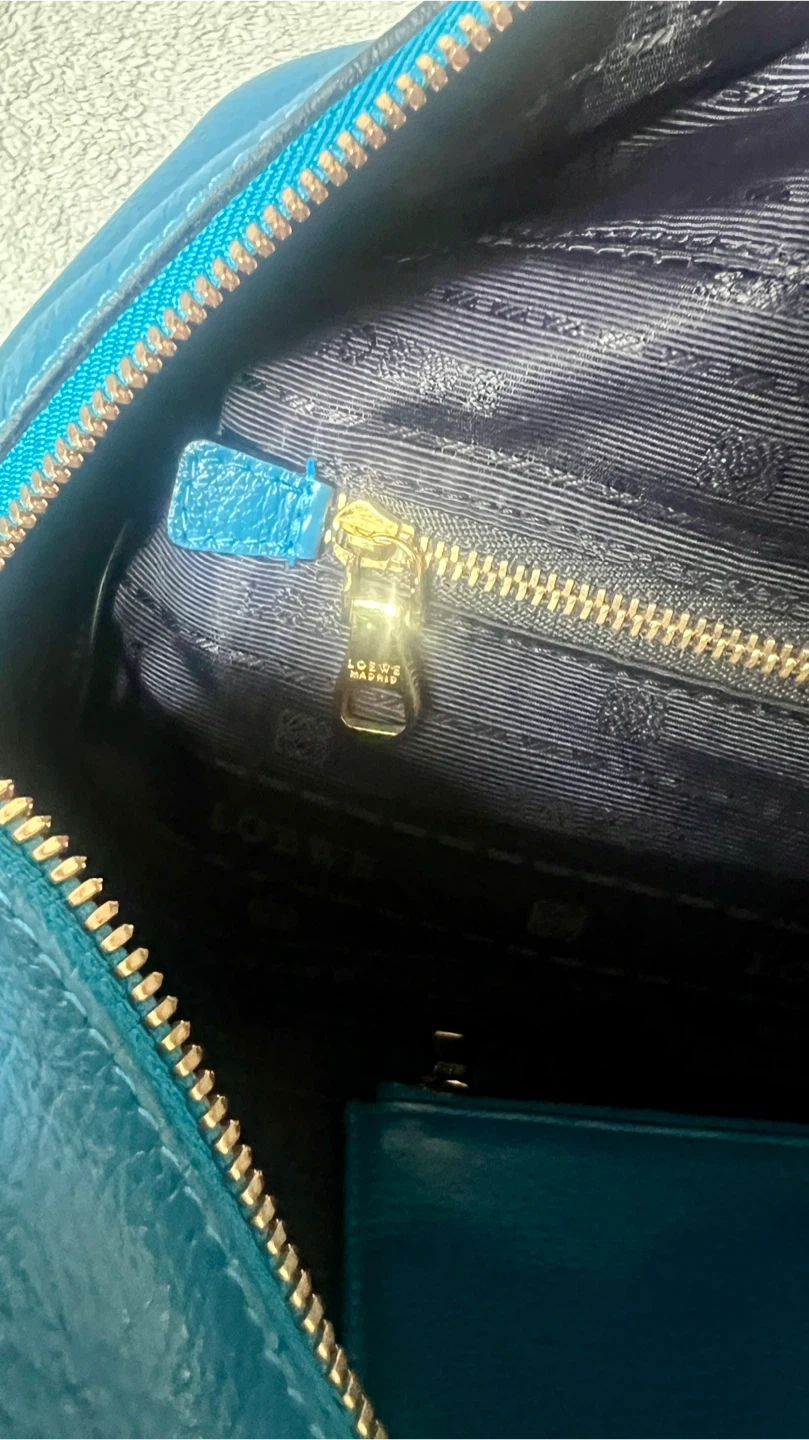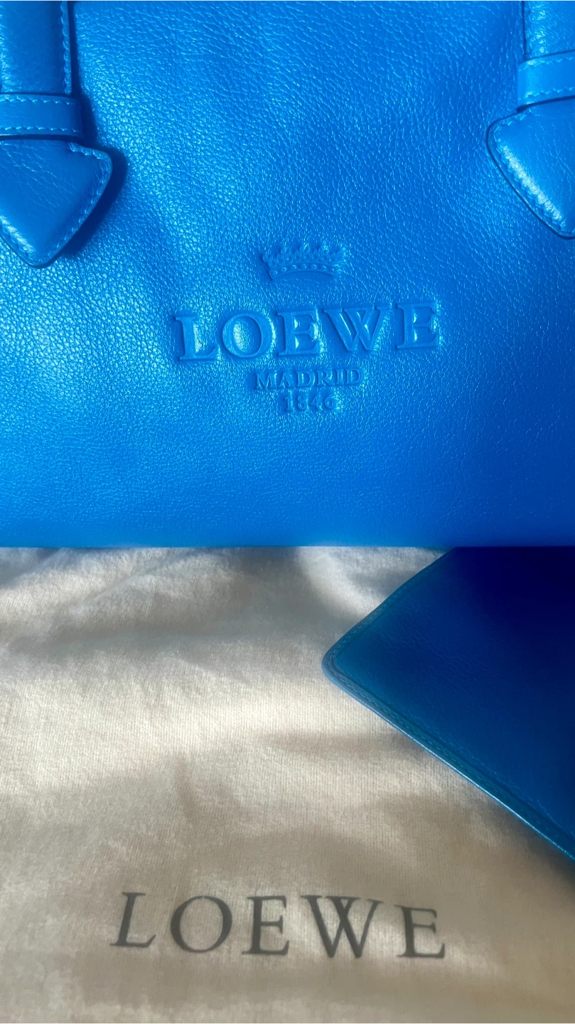 This is a vibrant blue leather handbag by Loewe. It comes with a matching detachable pouch and dust bag. Genuine leather, very spacious.