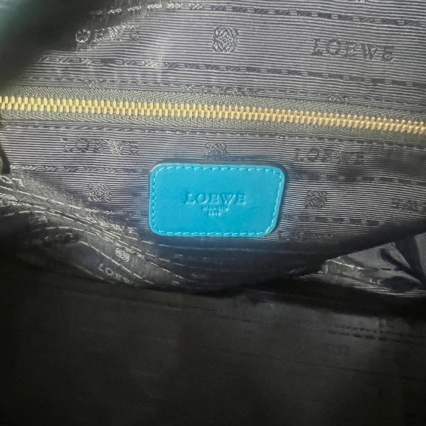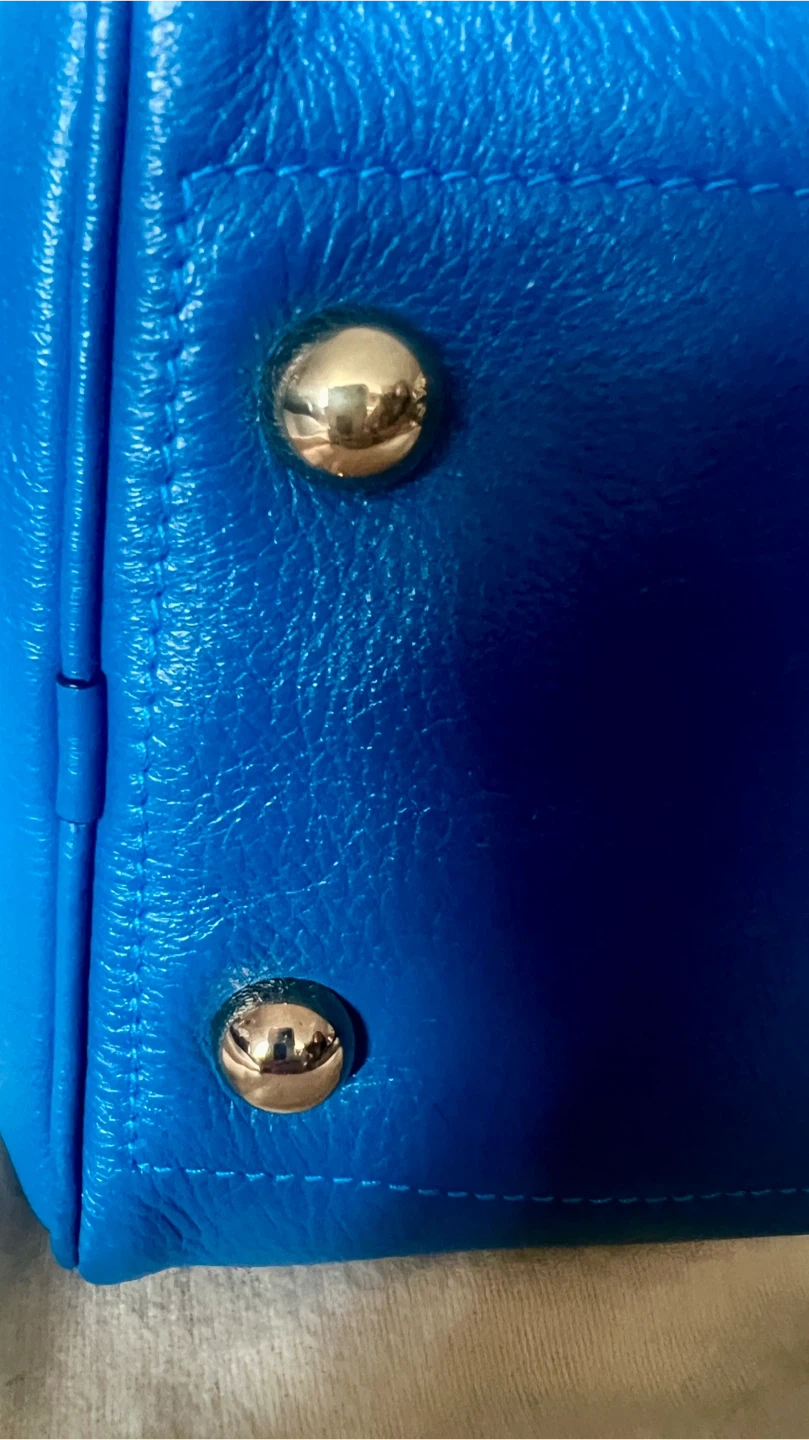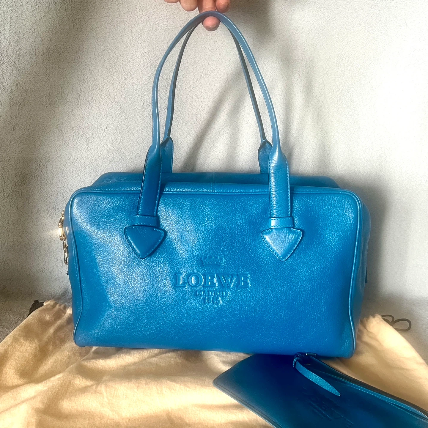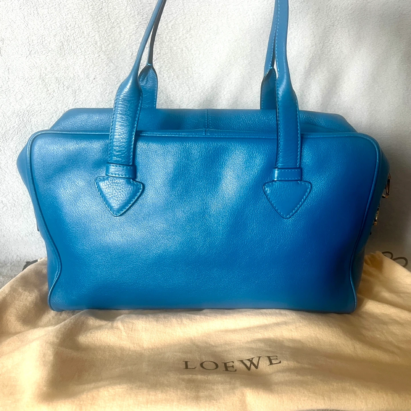This is a vibrant blue leather handbag by Loewe. It comes with a matching detachable pouch and dust bag. Genuine leather, very spacious.