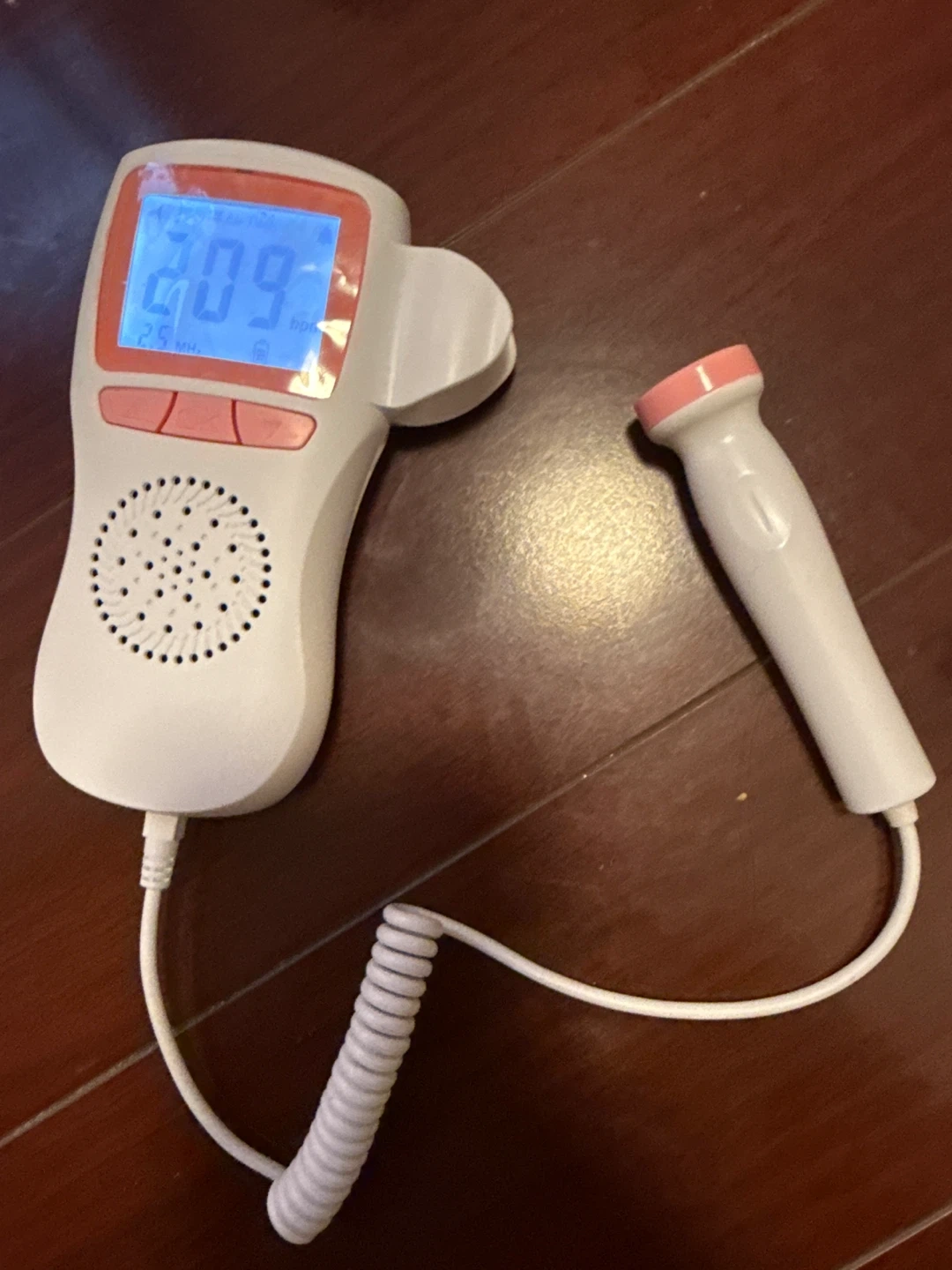 This baby fetal Doppler is a handheld device for listening to your baby's heartbeat. It has a clear digital display showing the heart rate. It operates at 2 MHz frequency. This device is great for expecting parents wanting to hear their baby's heart.