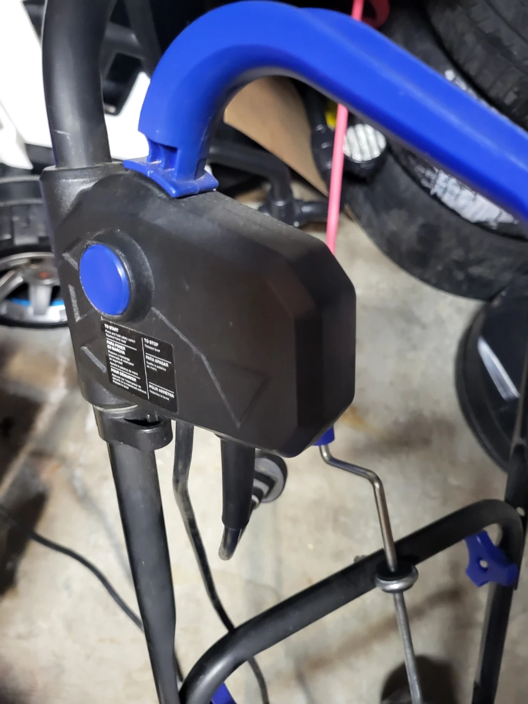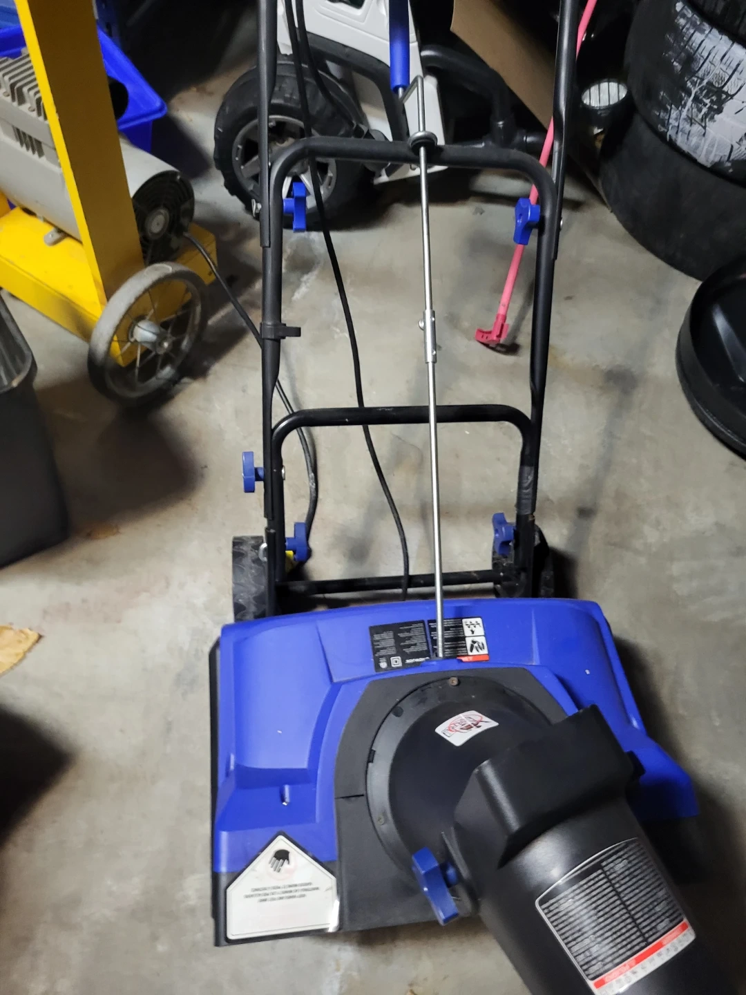 This is a Snow Joe electric snow blower. It's blue and black with a powerful motor. It's perfect for clearing sidewalks and driveways!
