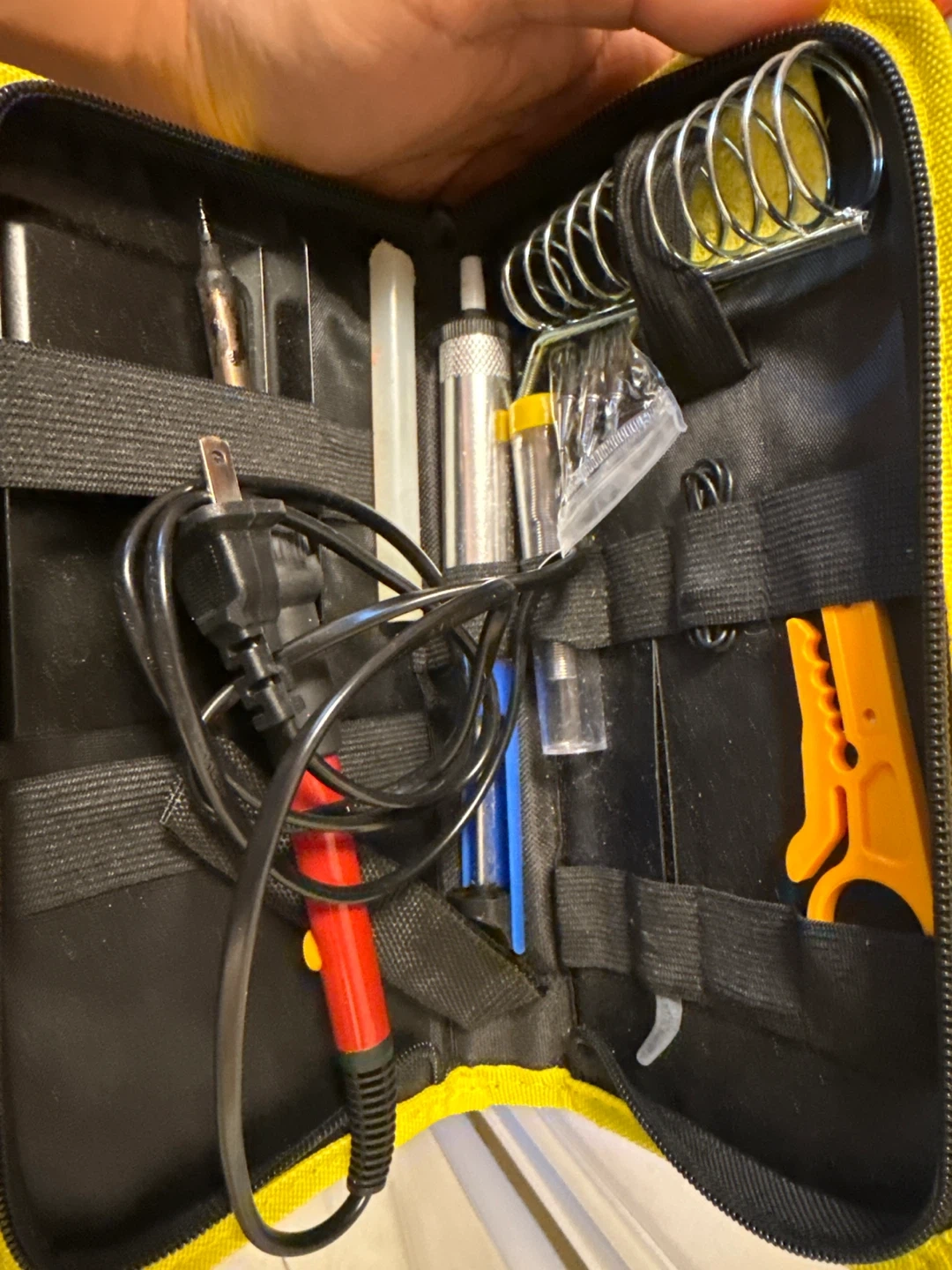 This soldering iron kit includes a red and black soldering iron, a metal stand with a sponge, wire strippers, and extra tips. It comes in a yellow zippered case for easy storage and transport. The kit has various small tools for soldering projects.