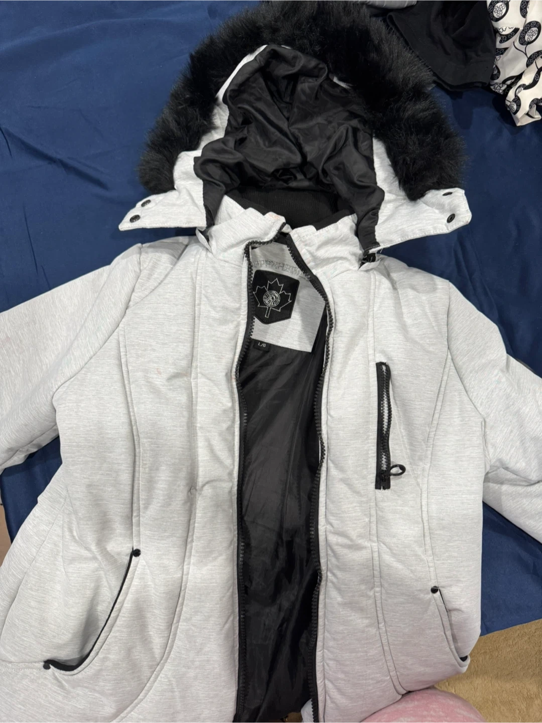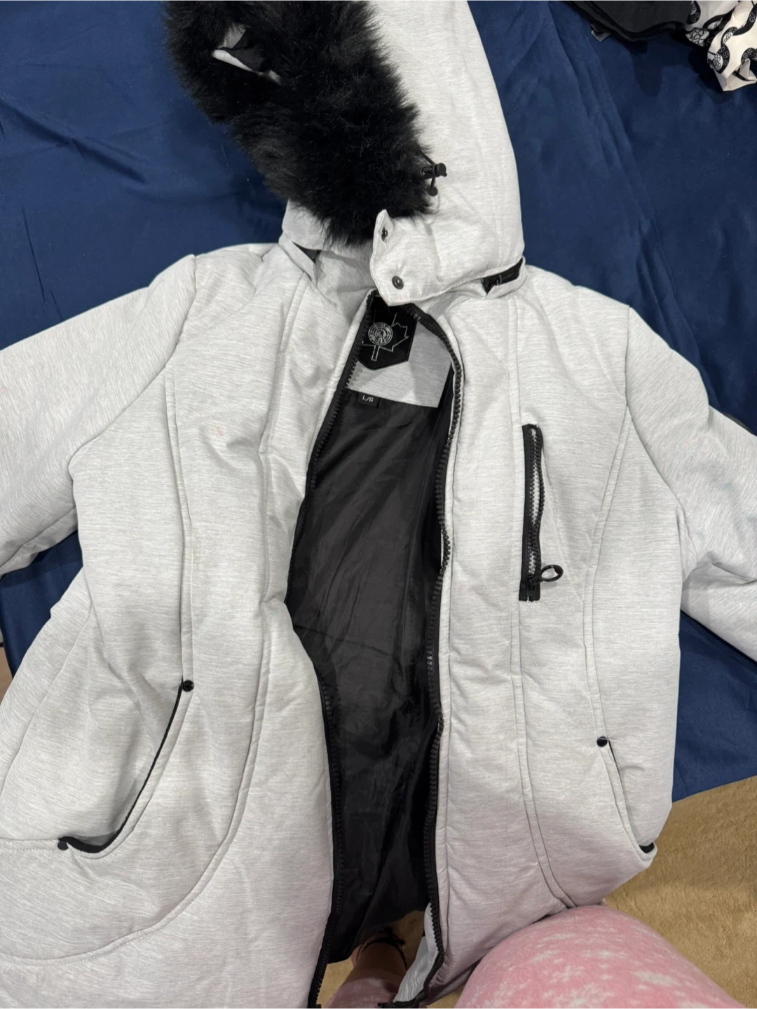 This light grey puffer jacket features a cosy fur-lined hood. It's designed with multiple zippered pockets for secure storage. The interior is lined with black fabric.