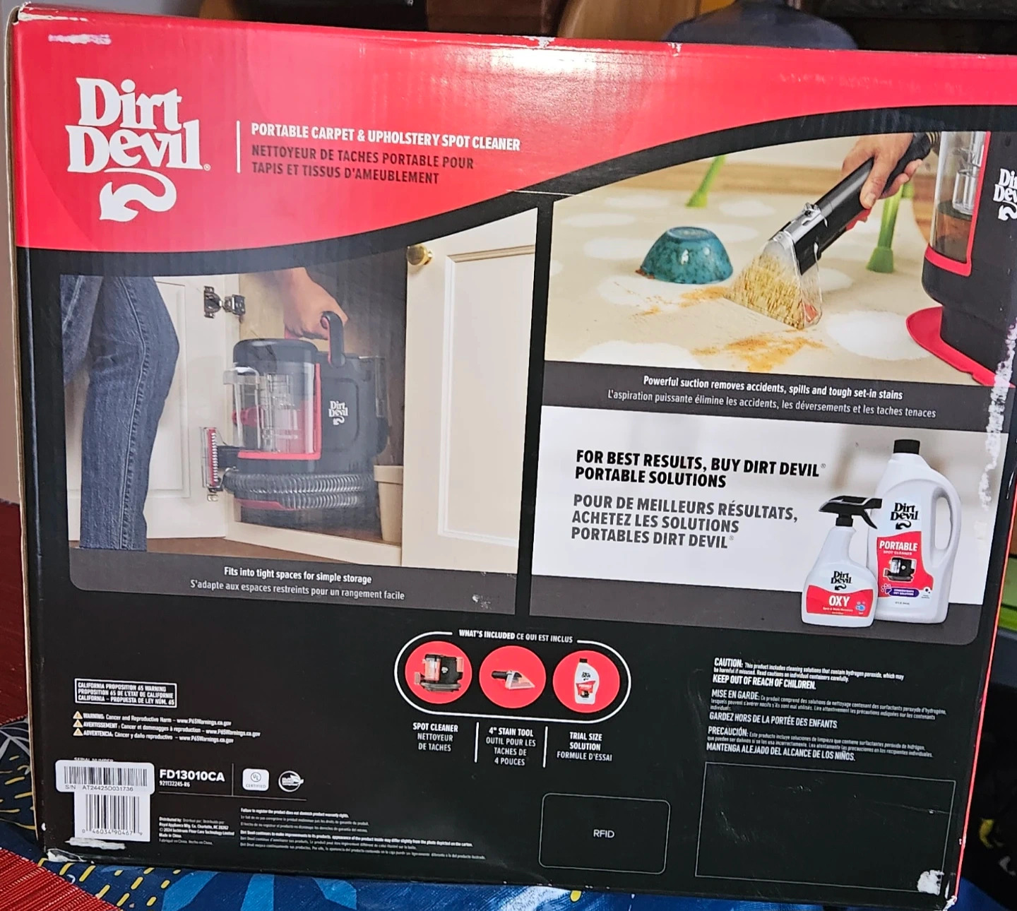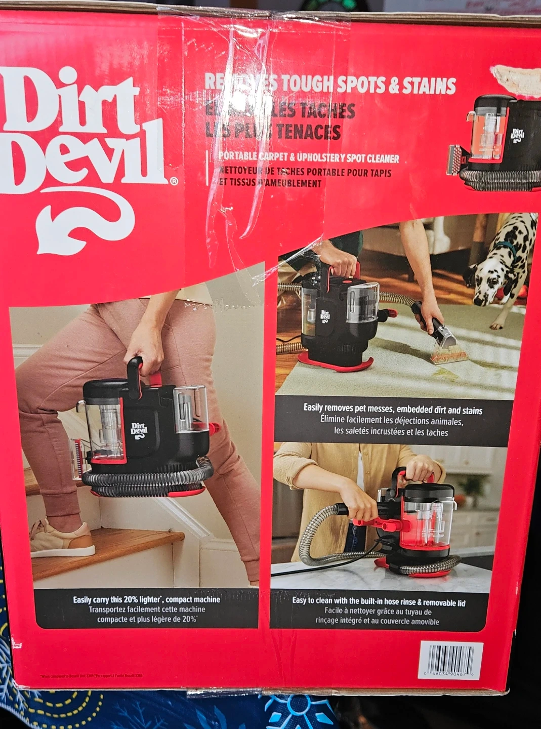 This Dirt Devil portable spot cleaner removes tough spots and stains. It's compact and lightweight for easy carrying. Features powerful suction and a 19 oz tank capacity for cleaning multiple messes. Fits into tight spaces for simple storage. Looking for the right home ;)