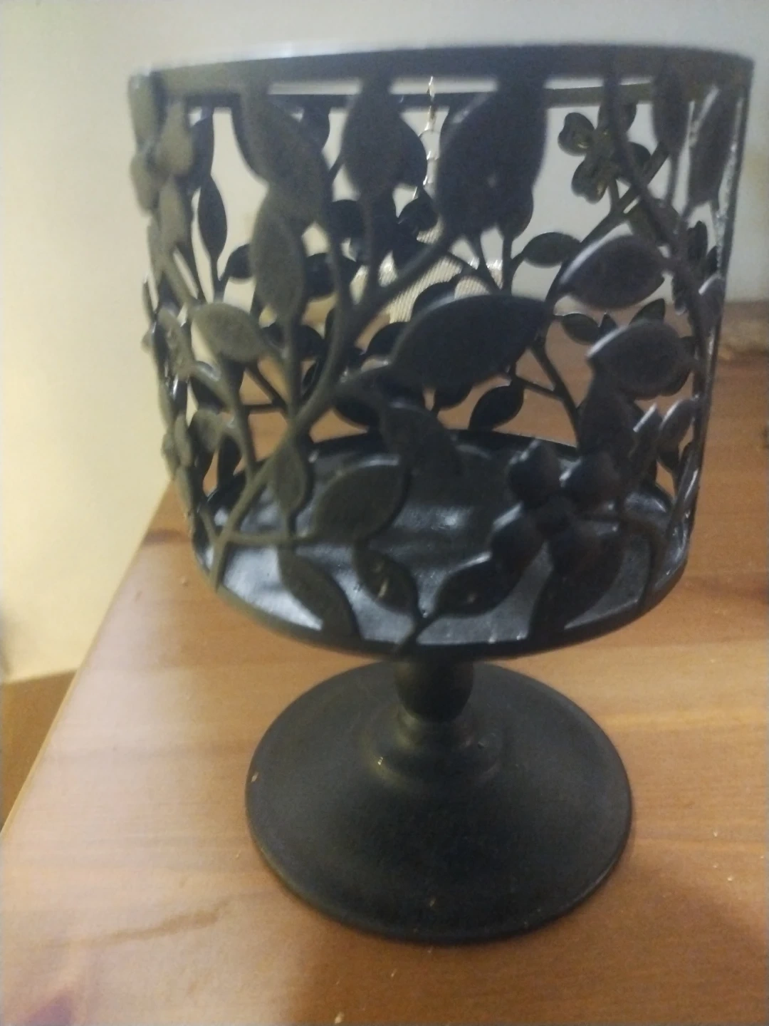 This decorative candle holder features an intricate black floral metal design. It's designed to hold a pillar or jar candle. This piece is perfect for adding a touch of elegance to any tabletop or mantel.