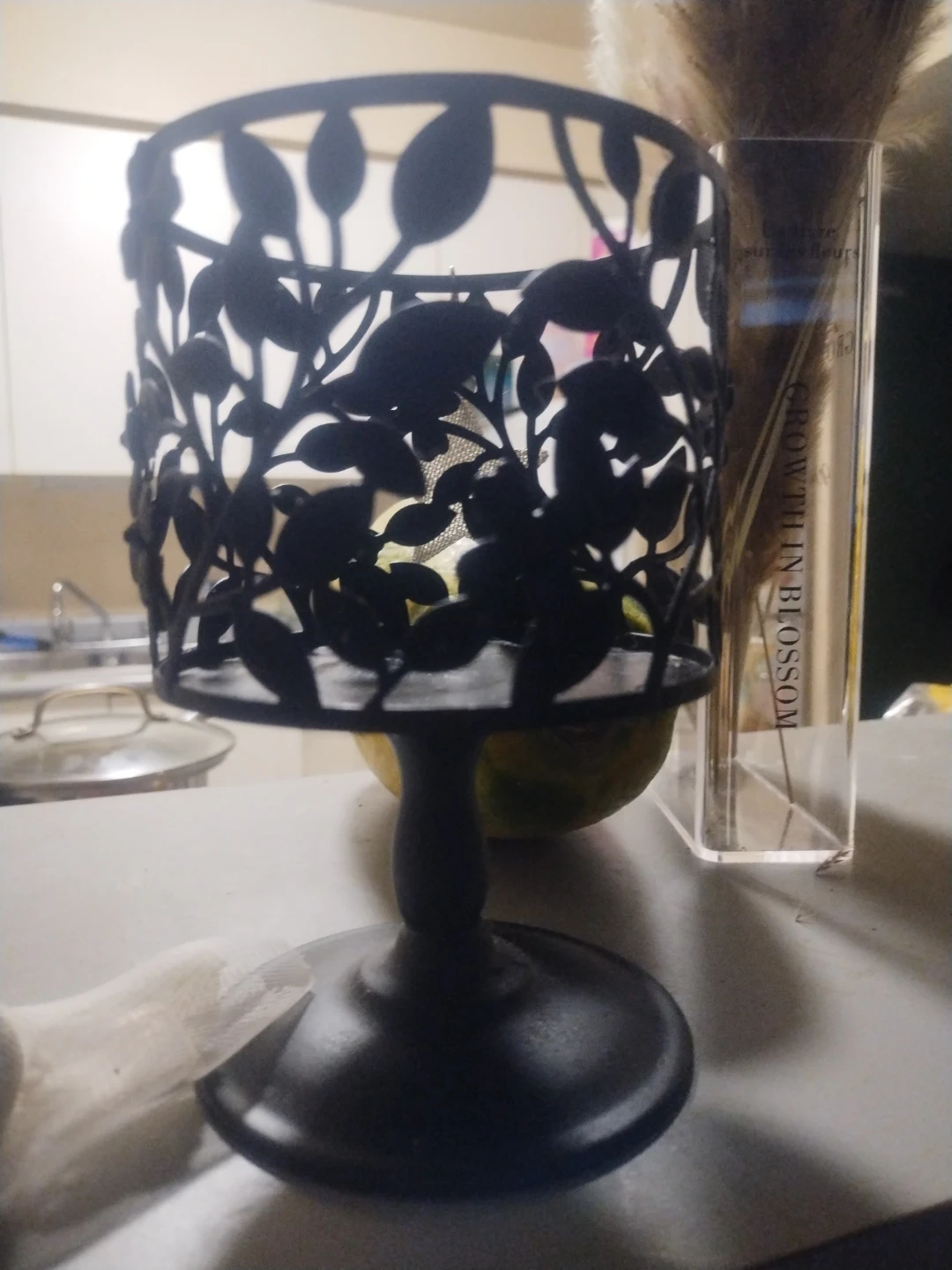 This decorative candle holder features an intricate black floral metal design. It's designed to hold a pillar or jar candle. This piece is perfect for adding a touch of elegance to any tabletop or mantel.