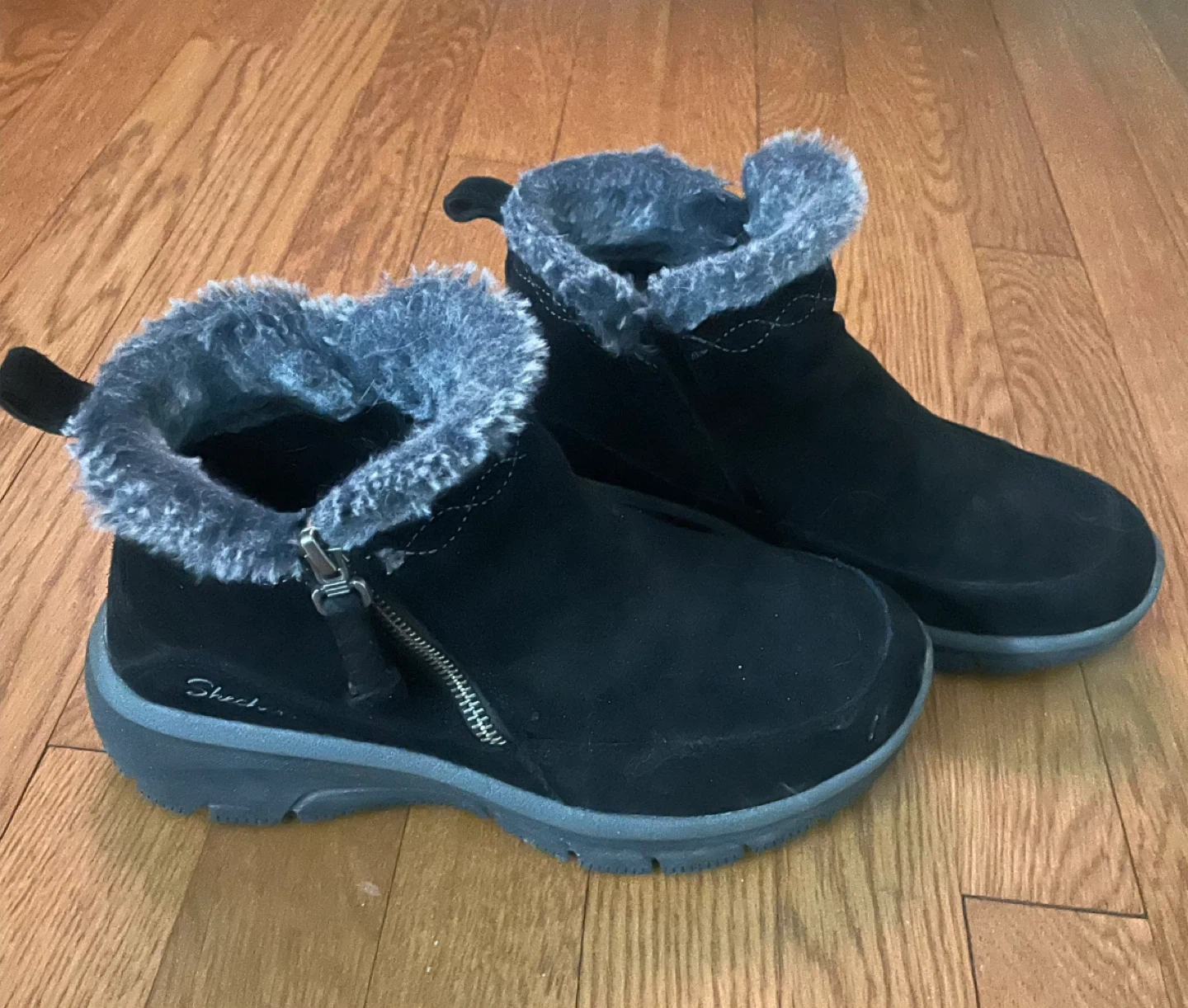 Cozy Skechers winter boots in black suede. They feature a soft faux fur lining for warmth and a side zipper for easy on and off. The durable soles provide good traction.