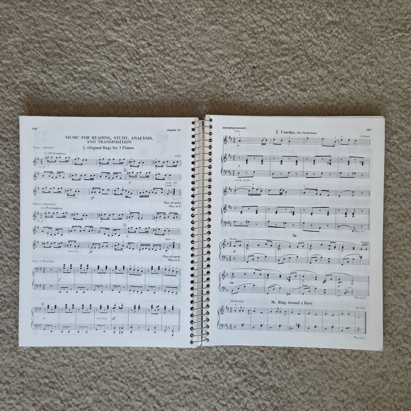 This is a copy of Harmonizing at the Piano by Arthur Frackenpohl - Sixth Edition. It's in great condition with no markings on the sheet music itself. There are a few lines of markings on the inside front and back cover, but otherwise, this songbook is pristine. Spiral-bound paperback.