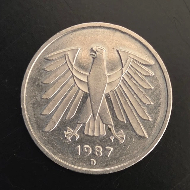 A vintage 5 Deutsche Mark 1987 D coin from the Federal Republic of Germany, used before the switch to the euro. The pictures show the actual coin for sale. Denomination: 5 Mark. Composition: Copper Nickel. Circulated. Year: 1987 D. Grade: Ungraded. Country/Region of manufacture: Germany. Condition: Used - Good. More Info: Vintage, Antiques. Cash accepted.