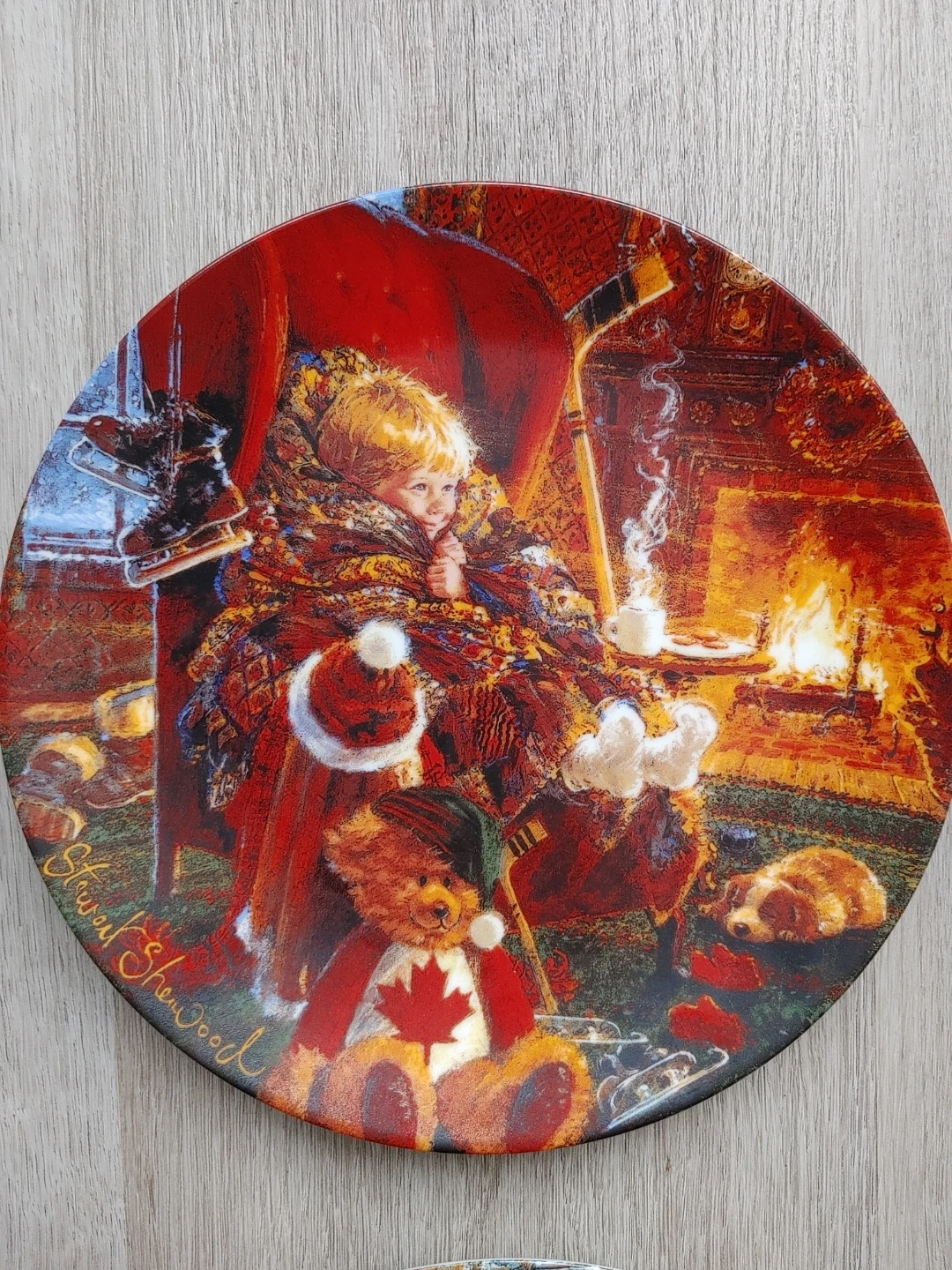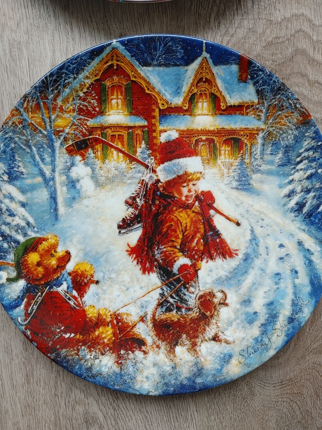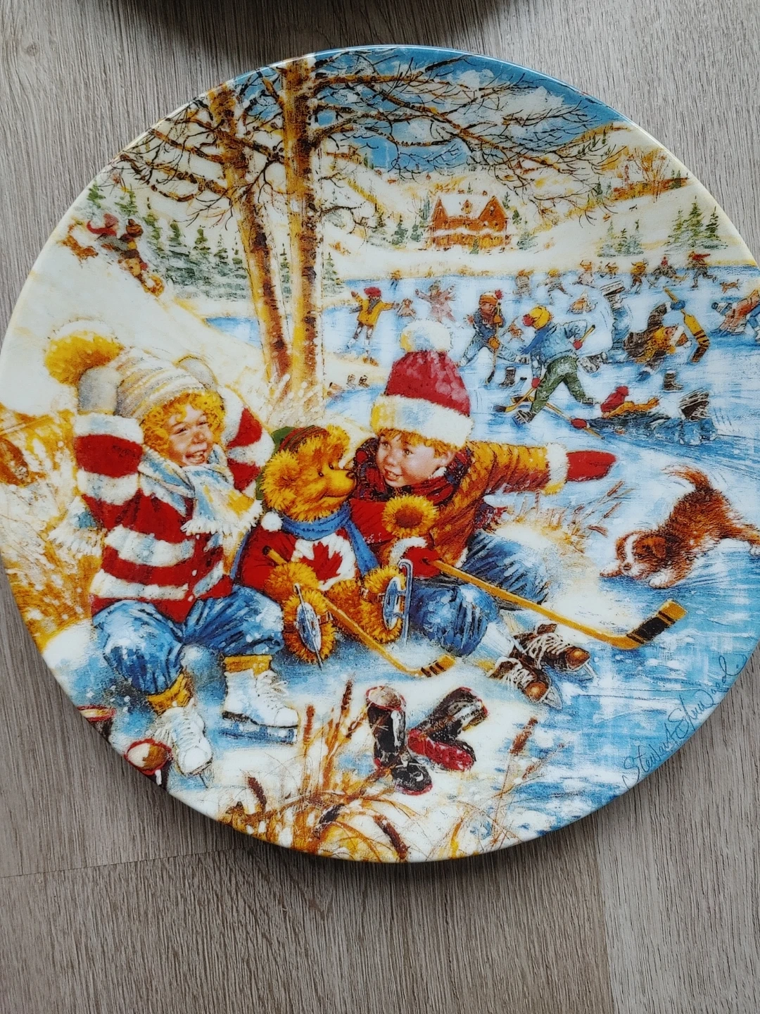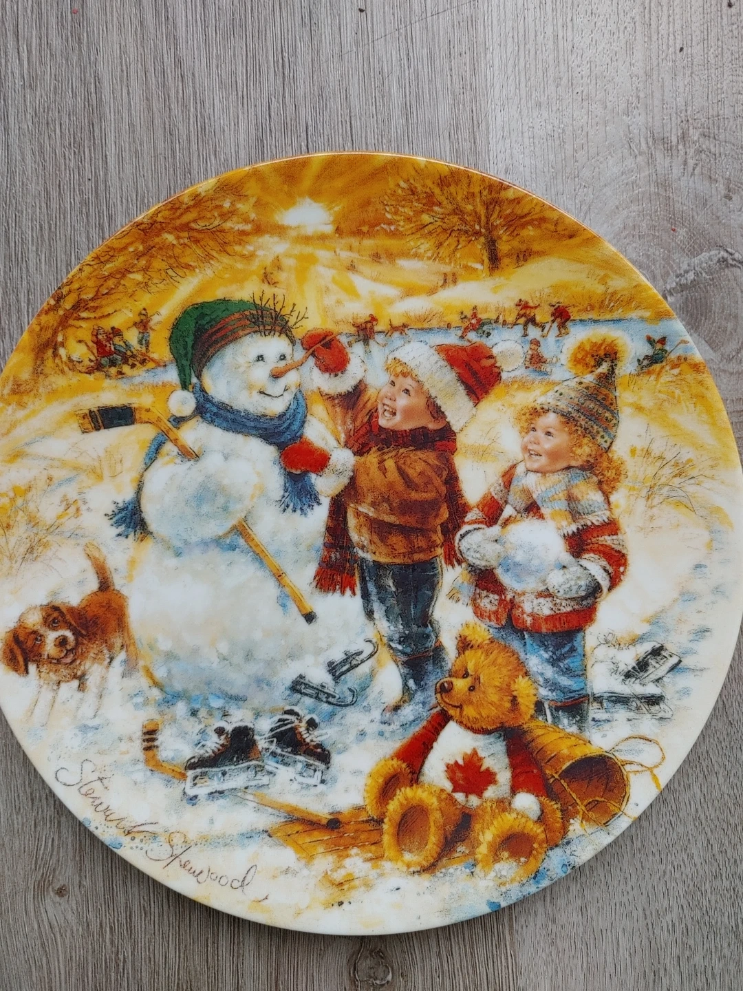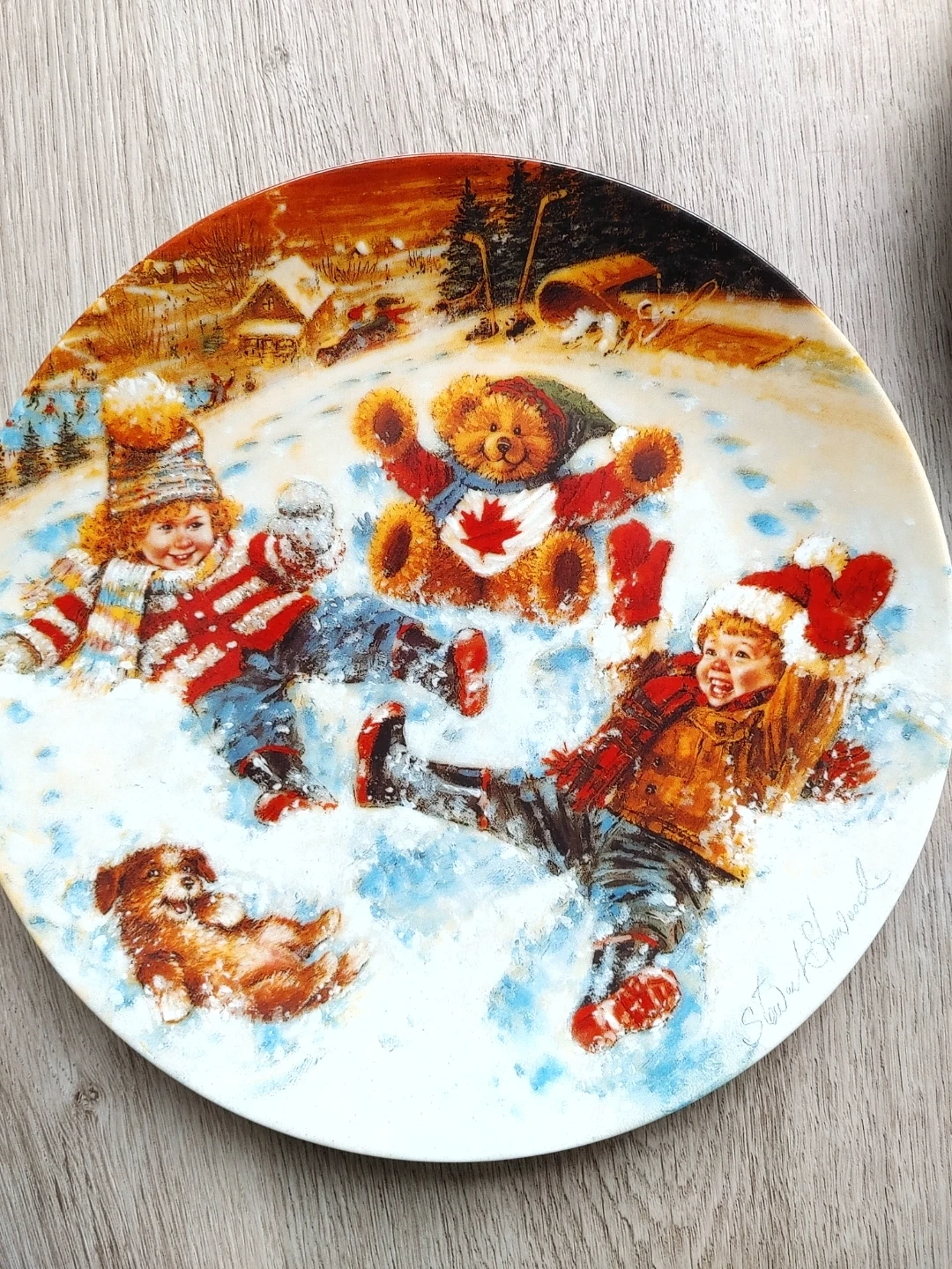 The series The Joys of Childhood collection by Stewart Sherwood. It's based on the original work depicting a young Canadian boy and his Teddy Bear enjoying all the things of our Canadian winter. The edition is strictly limited to 150 firing days. This art object is not for food use. This set has always been displayed in a glass cabinet.