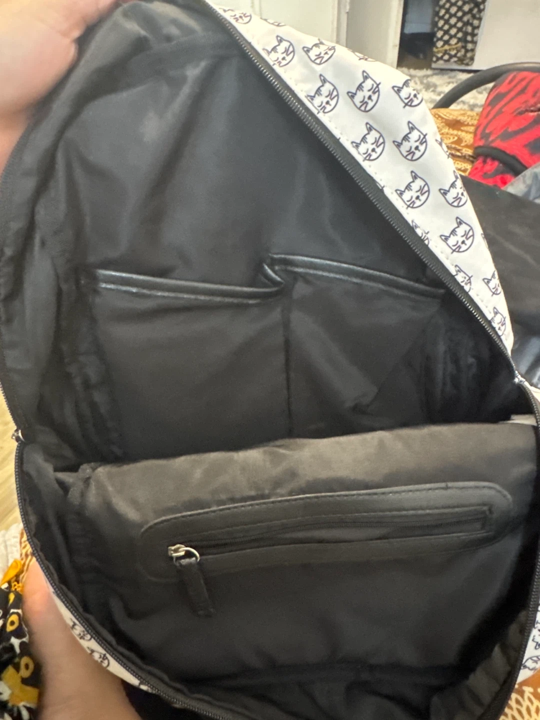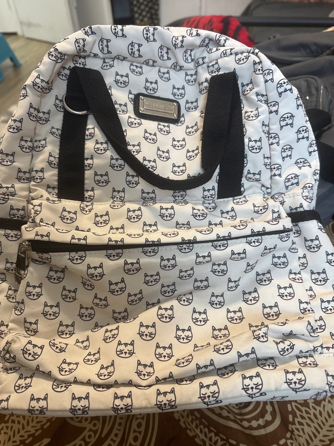White backpack with black cat print