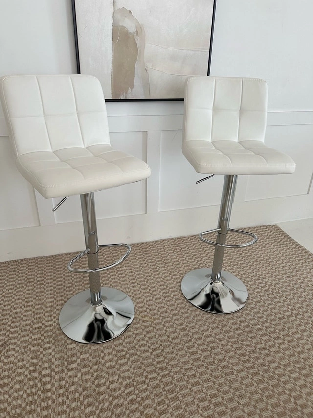 Add a modern touch to your kitchen or bar area with these sleek white bar stools, featuring a comfortable, quilted seat design and a sturdy chrome base. The stools are new in boxes, offering adjustable height for a customized fit. If the ad is up, the stools are available and ready to elevate your space. Adjustable Height, Quilted Seat Design, Chrome Base, White Colour. Perfect for counter height islands or bars.