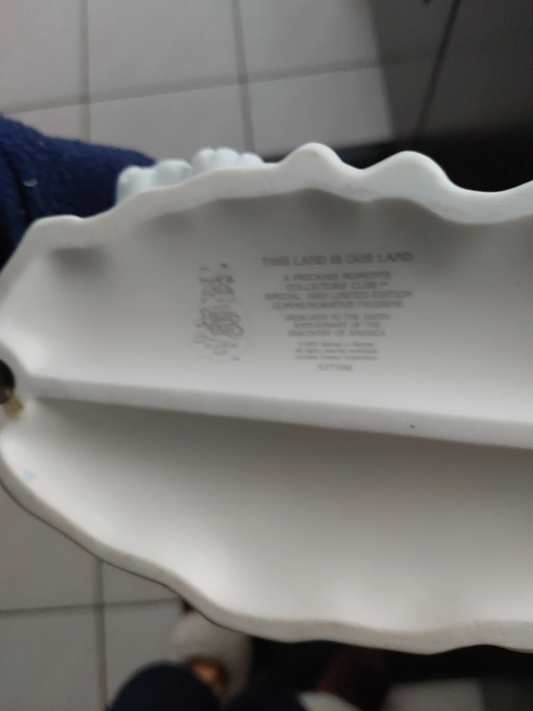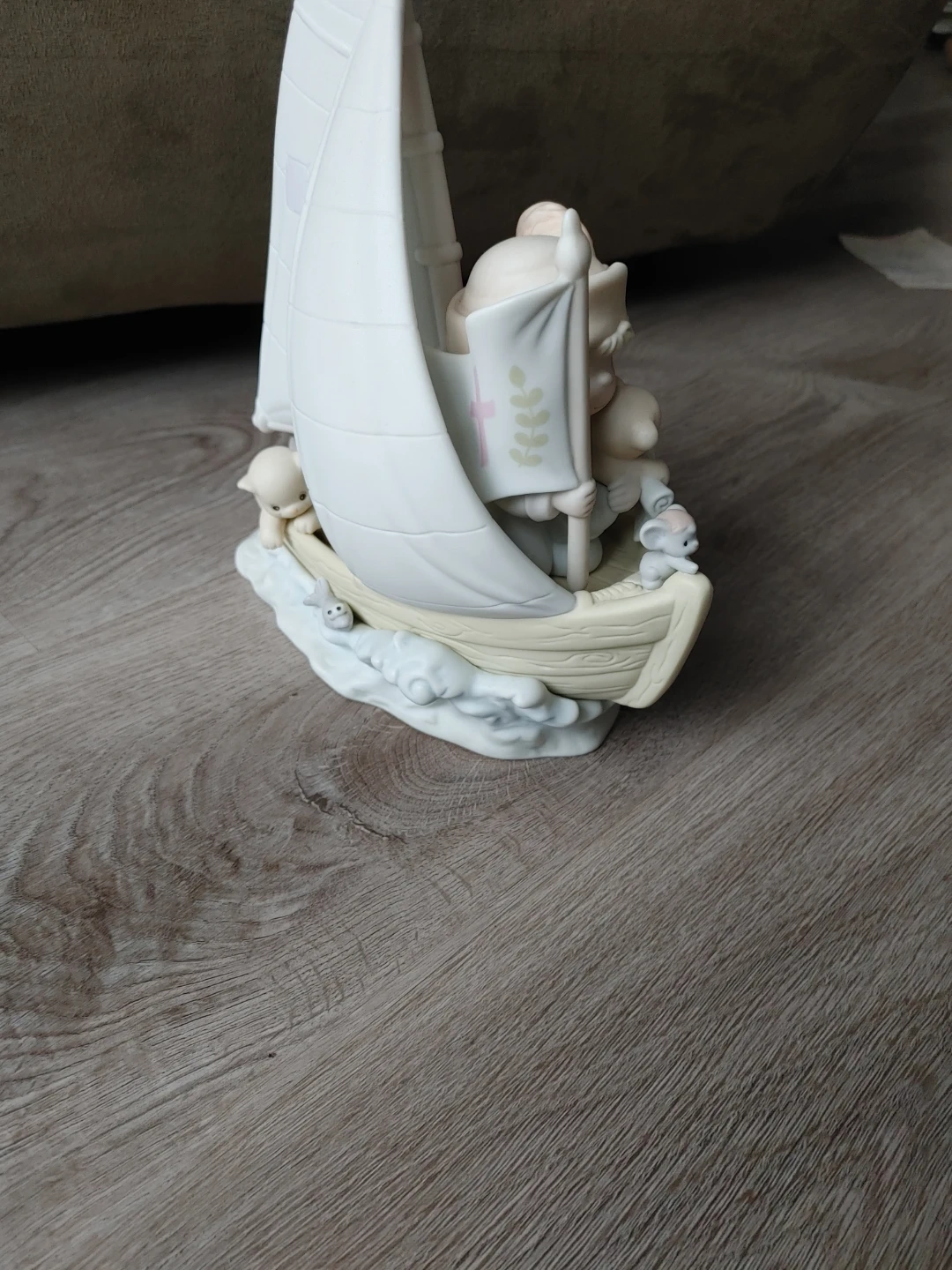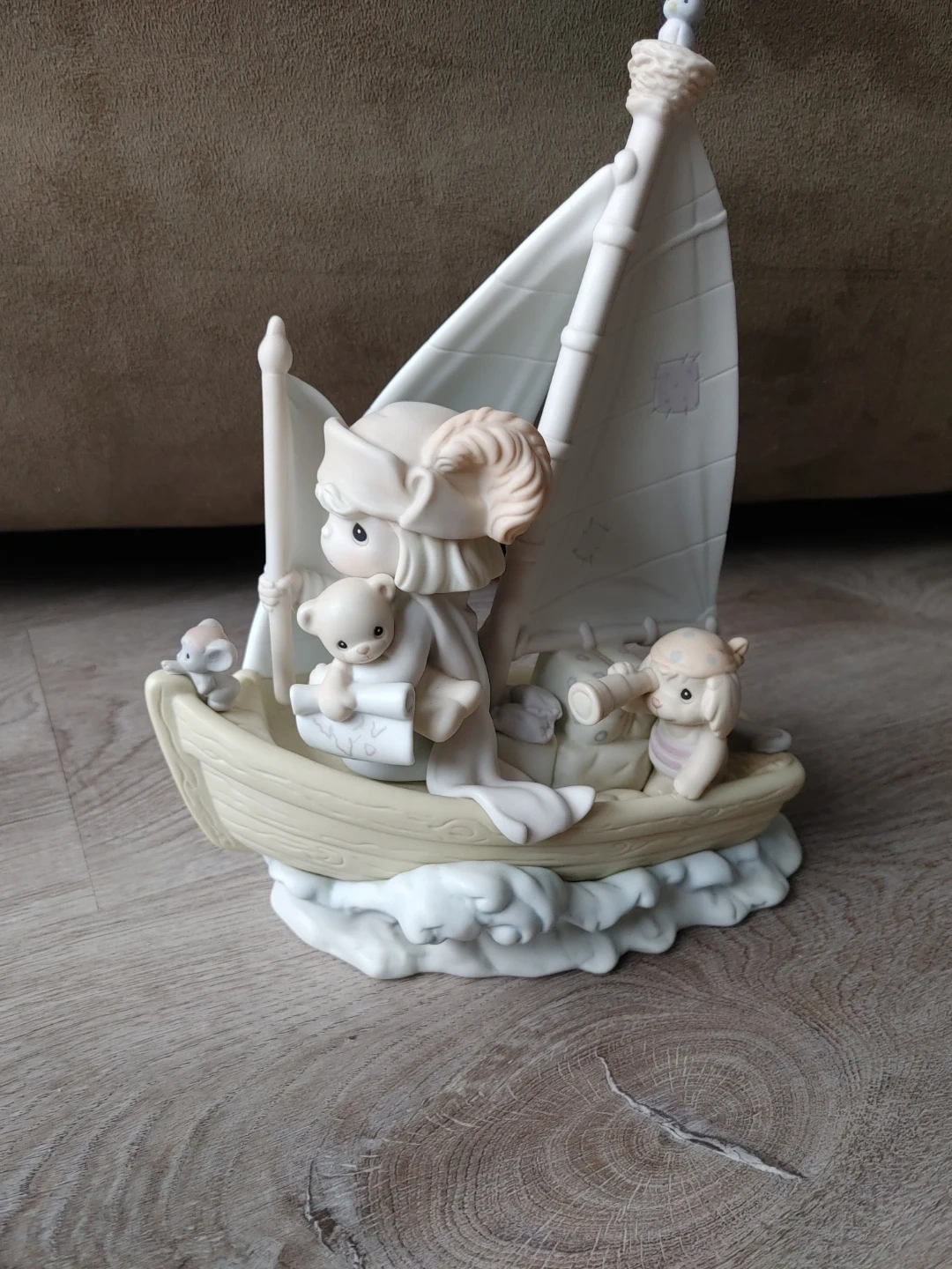 A Precious Moments Collector's Club commemorative piece. This figurine "This land is our land" depicts a sailboat with the sailor and his trusted "crew" animals. It's made of porcelain and features a white sail with a cross emblem. Great for collectors or as a decorative piece! This piece has always been in a glass cabinet.
