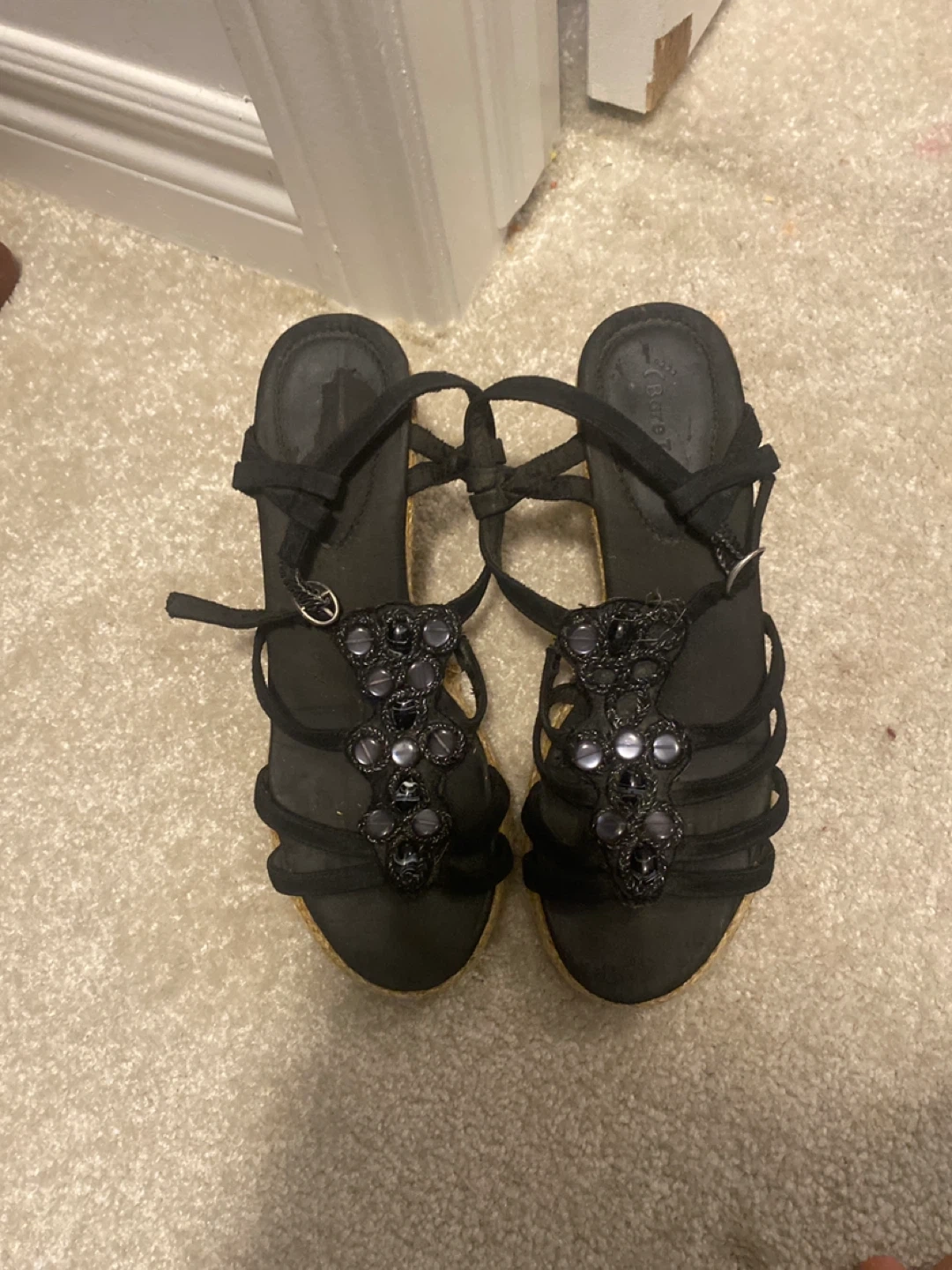 BareTraps black wedge sandals with embellished detailing. The straps are made of a soft textile material with a cushioned footbed. Cork-style wedge heel.