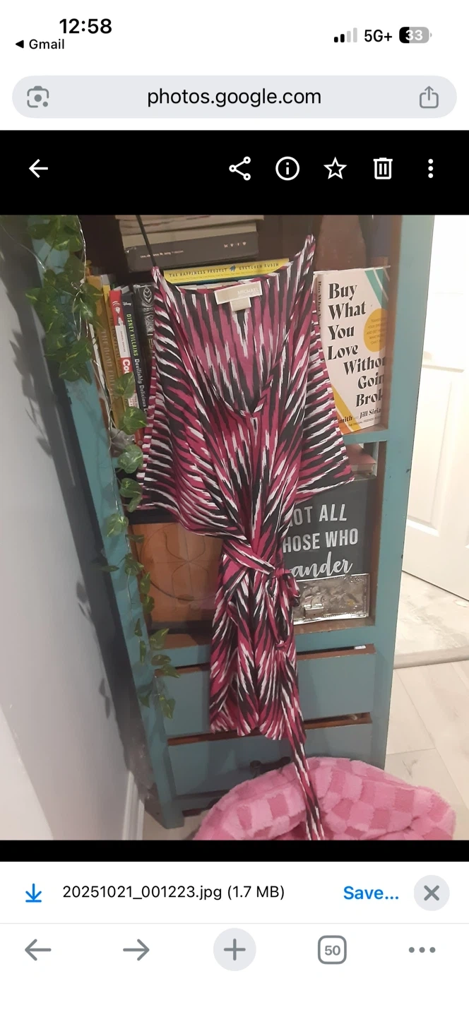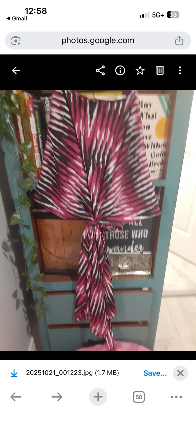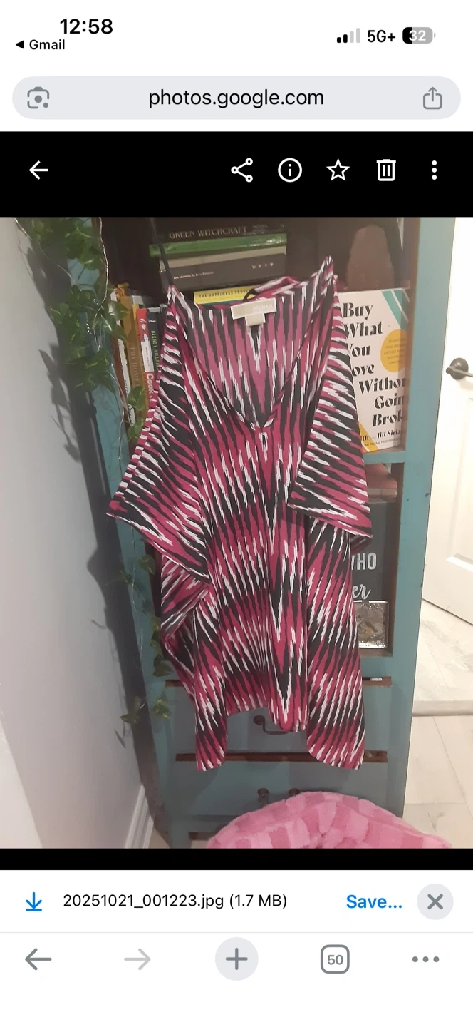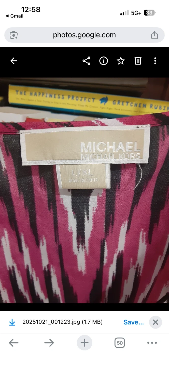 A stylish Michael Kors women's top. It's a size L/XL with a bold pink, black, and white pattern. This top has a V-neck and wide sleeves, perfect for warm weather!