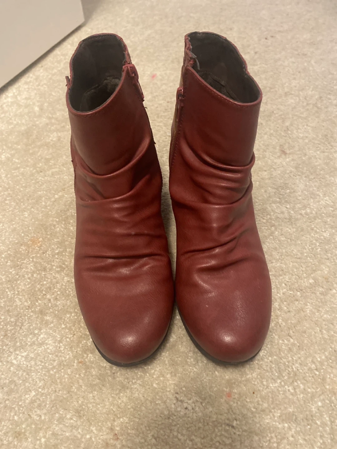 These are women's ankle boots in a lovely shade of red. They feature a ruched design and a side zipper for easy on and off. The heel height is approximately 2.5 inches.