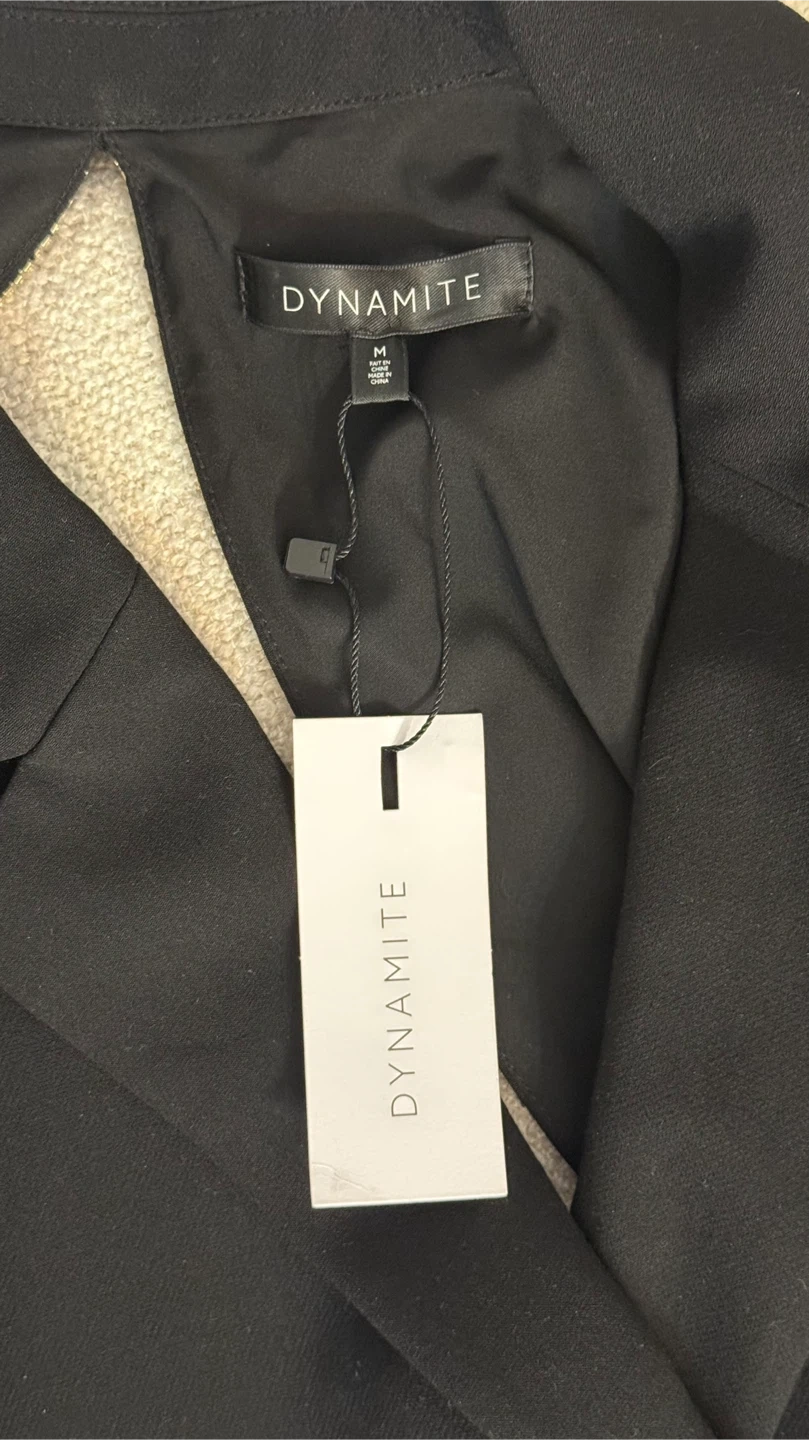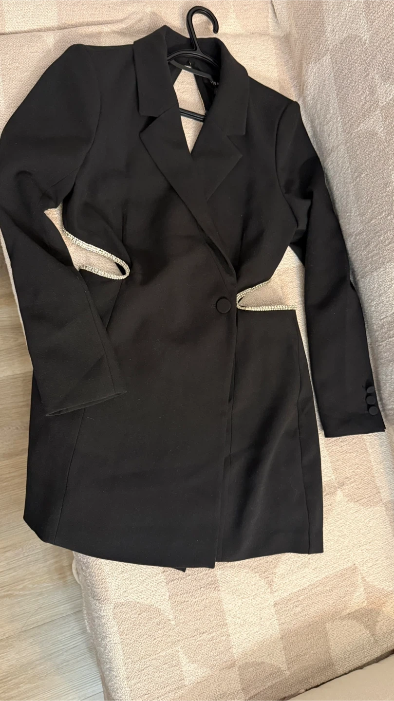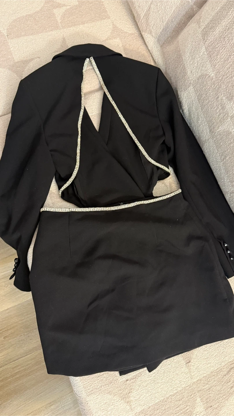 This is a DYNAMITE black blazer dress. It features a stylish cutout design with rhinestone trim along the edges. The dress is a size medium.