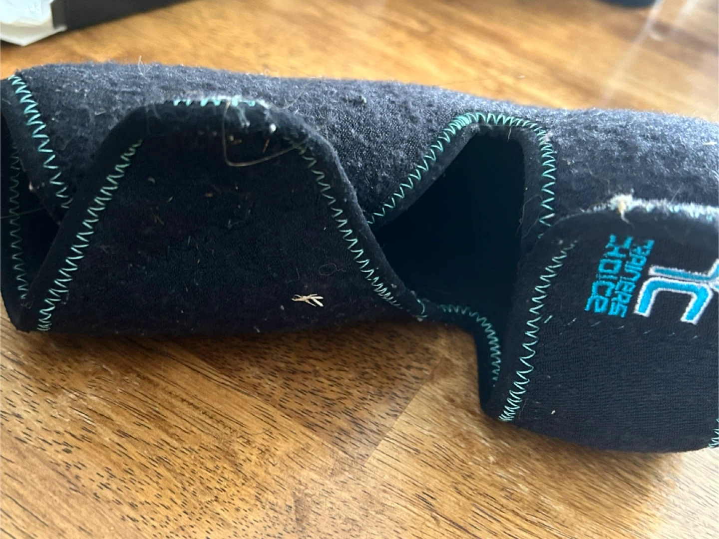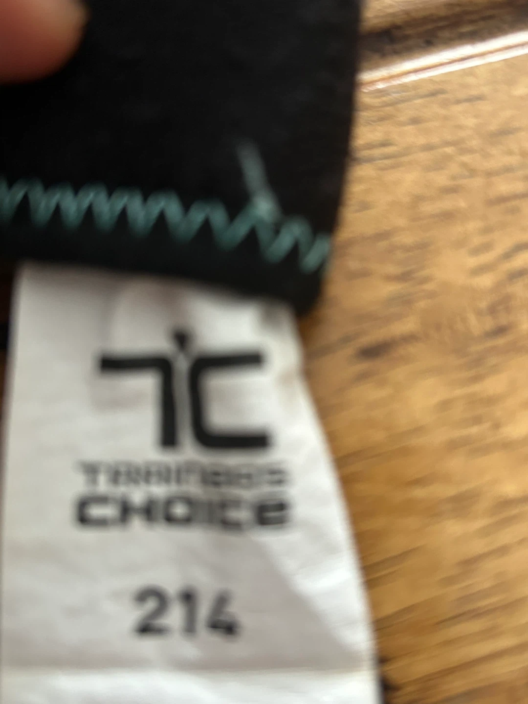 This is a black foot support from Trainer's Choice. It's made of a soft, breathable material with teal stitching. It's designed to provide comfortable support during activities.
